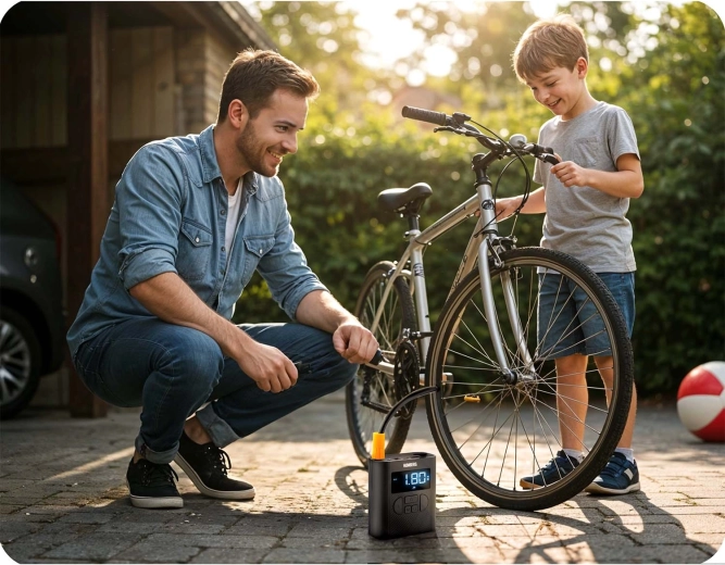 Quatre modes prédéfinis + réglage personnalisé couvrent la plupart des besoins. Idéal pour les pneus et l’équipement sportif – à la maison, au garage comme en déplacement.