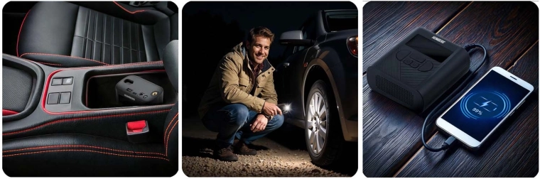 Utilisez-le pour les pneus de voitures, motos et vélos, ainsi que pour les ballons de sport ou les jouets gonflables. La lampe LED avec signal SOS renforce la sécurité lors des interventions nocturnes sur le véhicule et la powerbank recharge vos appareils.