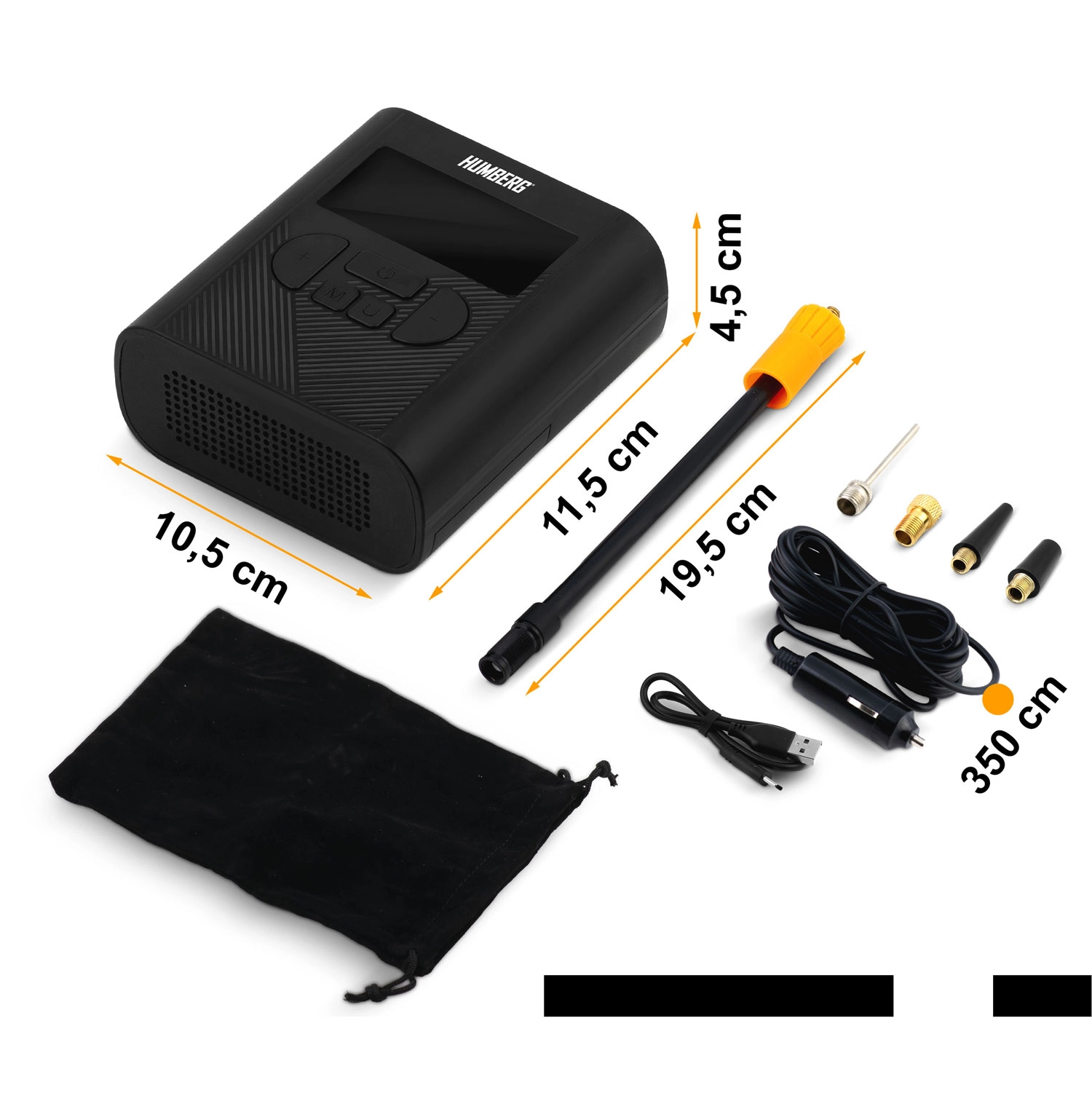- Tuyau haute pression, aiguille pour ballons, embout Presta, câble USB‑C, adaptateur auto 12 V (3,5 m), étui