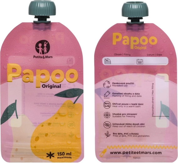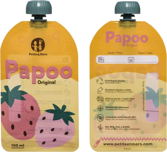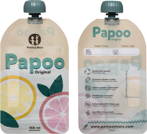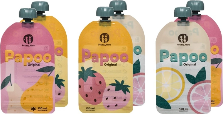 Les pochettes PETITE&MARS Papoo Original pratiques et écologiques d’un volume de 150 ml sont idéales pour les compotes, purées et yaourts à emporter. Elles peuvent être réutilisées, lavées au lave-vaisselle, congelées et facilement étiquetées. Sans substances nocives BPA, PVC et phtalates et conçues pour que les enfants puissent se nourrir seuls confortablement, sans désordre.