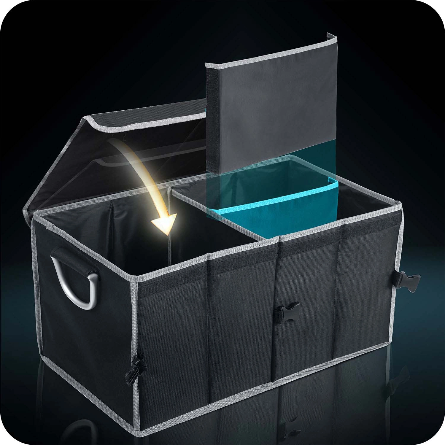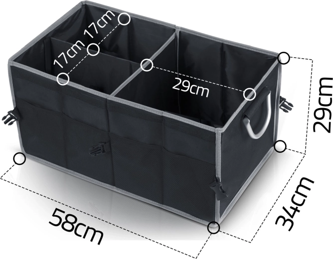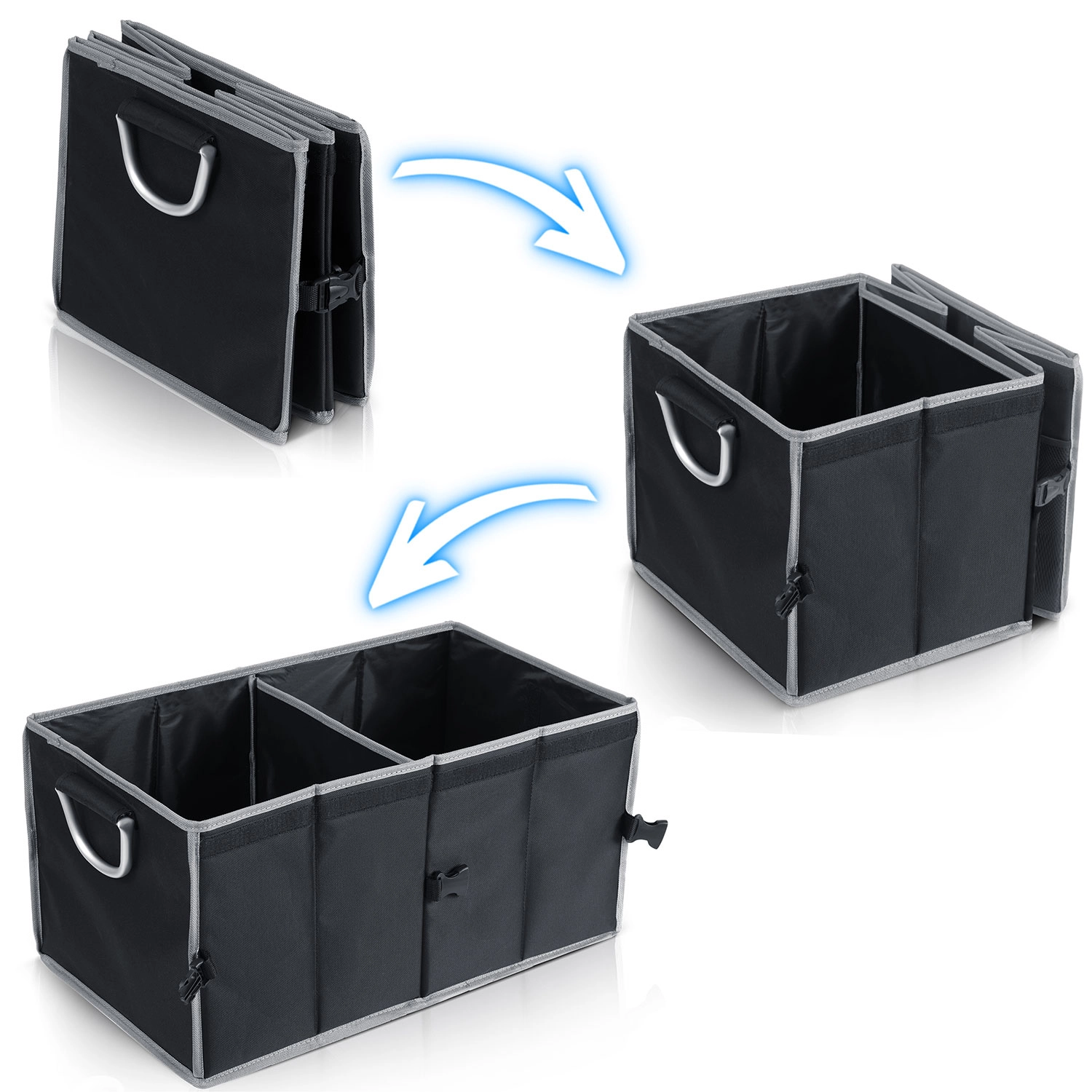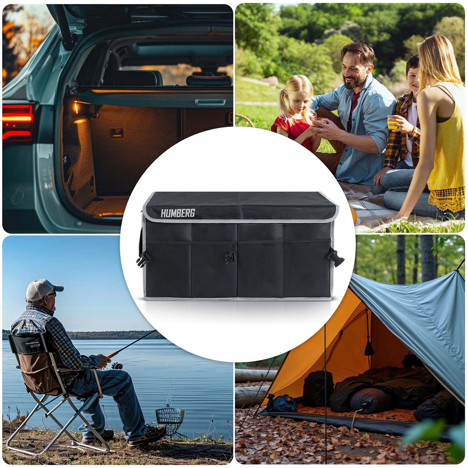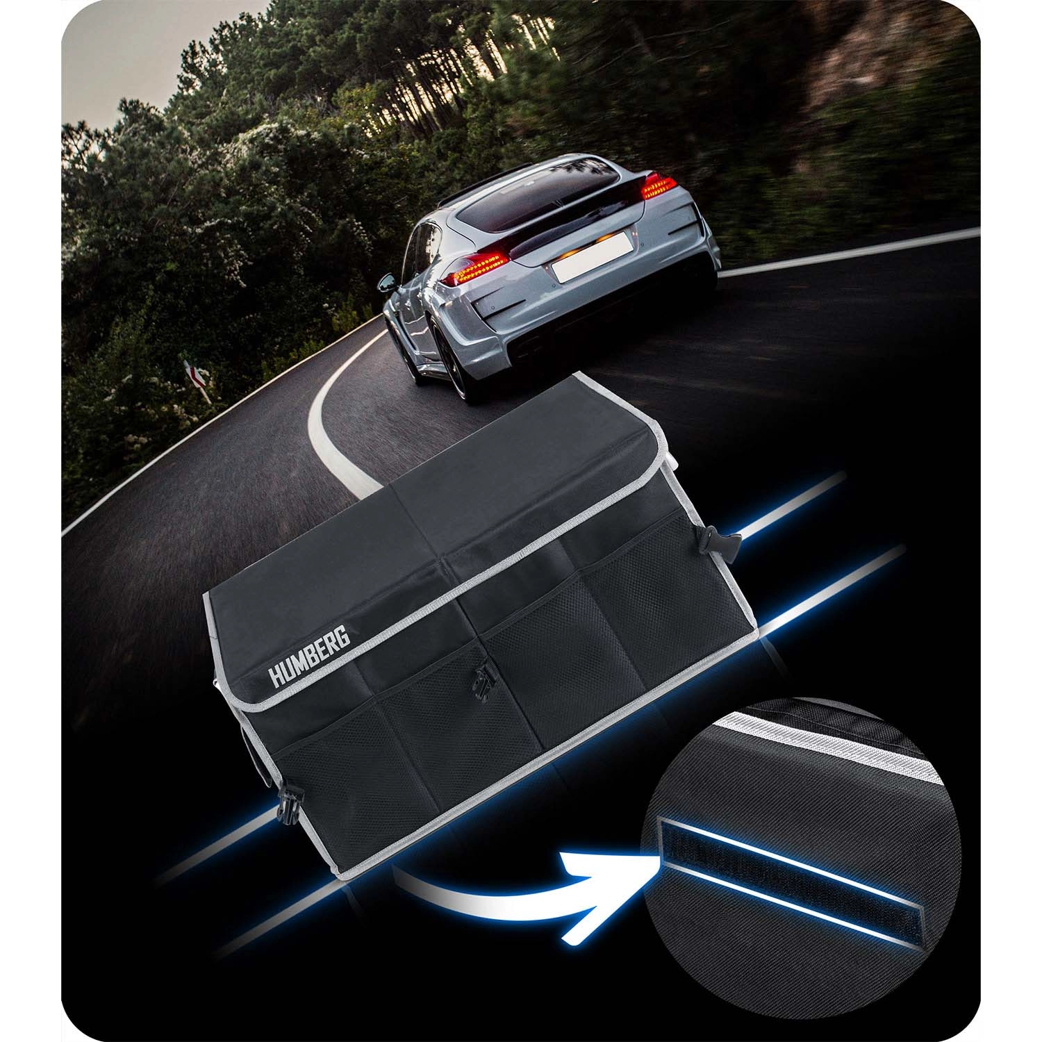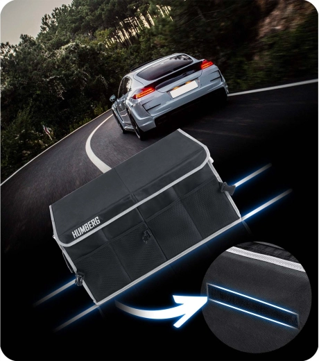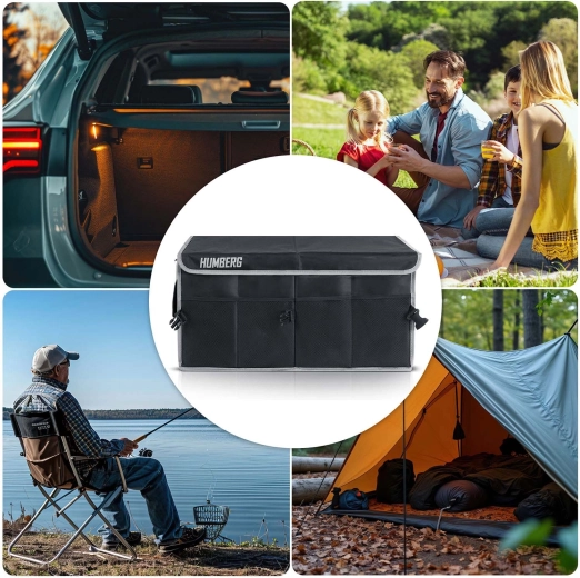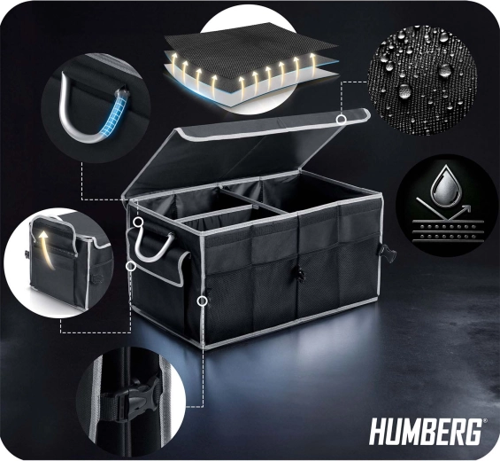 Transformez le chaos en un espace parfaitement organisé. L’organisateur de coffre HUMBERG est conçu pour un usage quotidien – pour les courses, les outils, les câbles, les produits d’entretien auto et même la trousse de secours. Sa construction modulaire permet d’utiliser un ou deux compartiments, ou de plier complètement l’organisateur à plat lorsque vous n’en avez pas besoin. Le couvercle rabattable et amovible dissimule discrètement le contenu et le protège de la poussière et du soleil.