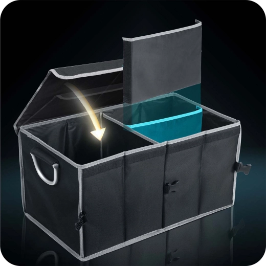 Adaptez l’espace à vos besoins. Utilisez un ou deux compartiments, déplacez ou retirez facilement la cloison, puis pliez l’organisateur à plat après usage.