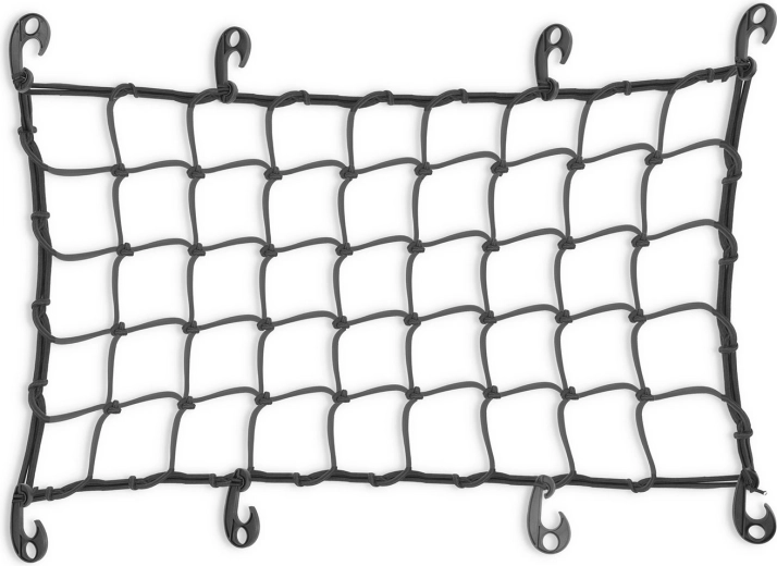 Un filet résistant et flexible avec 8 crochets maintient fermement la charge en place, même sur les surfaces irrégulières.