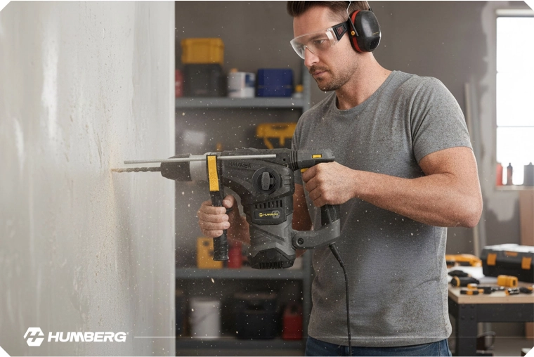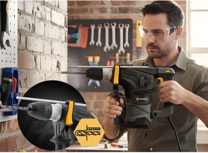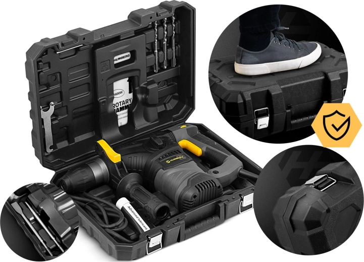 Puissance maximale et polyvalence dans un seul kit performant. Le marteau perforateur HUMBERG avec moteur à charbons robuste de 1600 W et énergie de frappe de 6 J gère les travaux exigeants en rénovation comme sur chantier. Le mandrin SDS Plus garantit un changement rapide des accessoires et une transmission de puissance fiable. Grâce à la variation continue de la vitesse de 1500 à 4000 tr/min, vous adaptez aisément la puissance au matériau et au type de tâche.