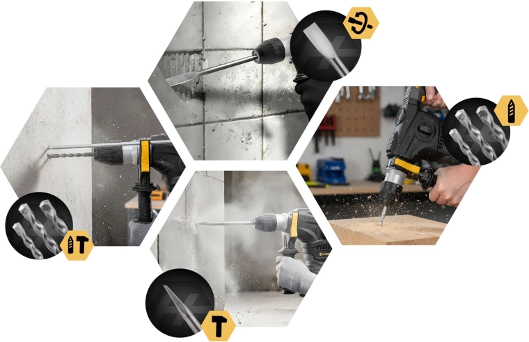 • Équipement complet : 3 forets SDS Plus (8/10/12 × 150 mm), 2 burins SDS Plus (pointe et plat 14 × 230 mm), poignée auxiliaire réglable, graisse technique, manchette anti‑poussière, butée de profondeur, clé de service