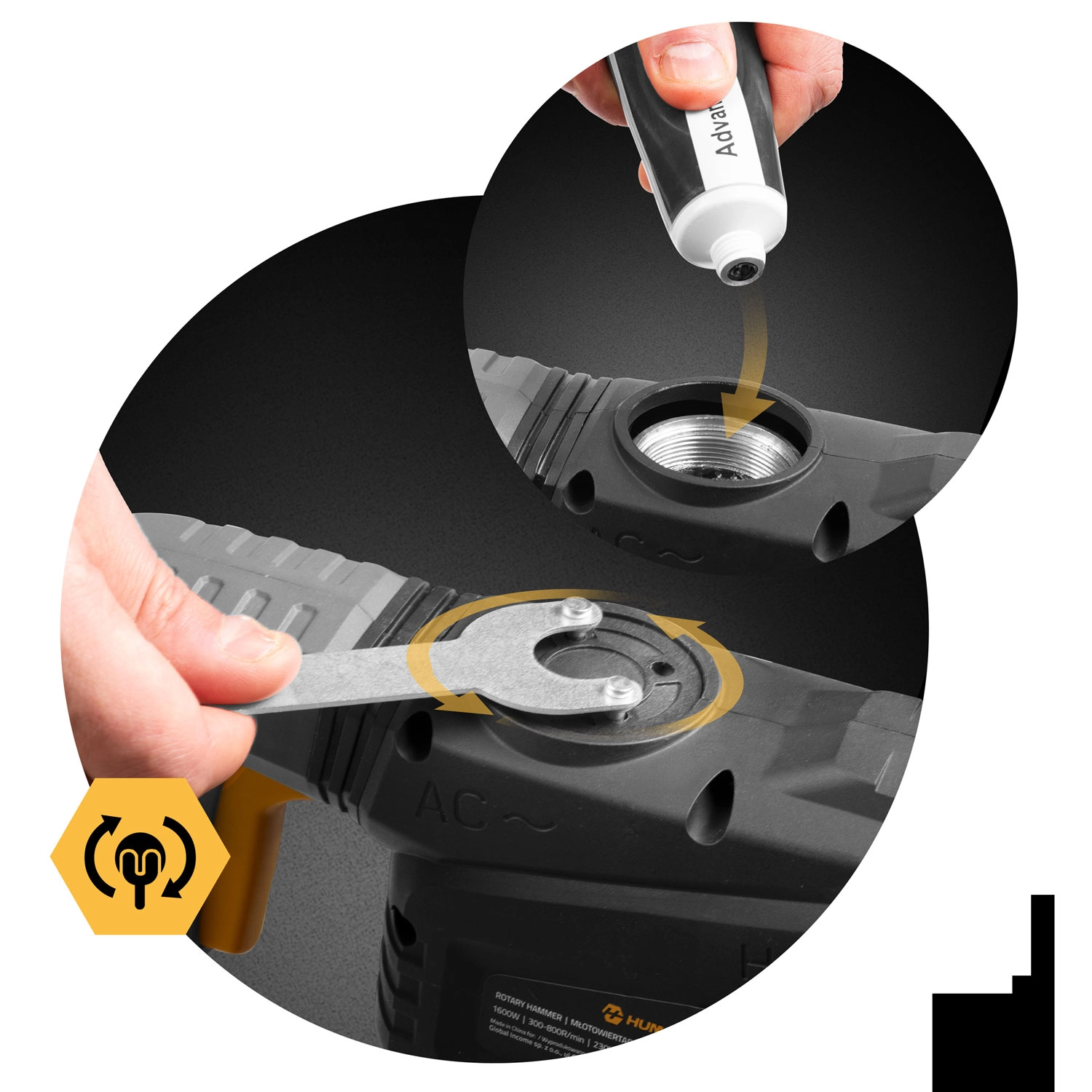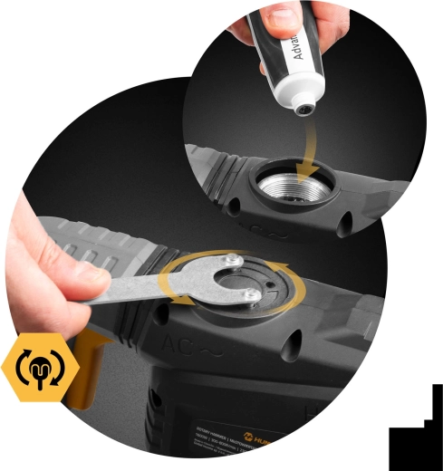 4 en 1 pour un travail efficace – basculez entre les modes perçage sans percussion, perçage à percussion, burinage et verrouillage/indexation du burin. La poignée anti‑vibrations et le bon équilibrage améliorent le confort même lors des travaux prolongés, le câble d’alimentation de 2 m offre une bonne liberté de mouvement et la lubrification de la boîte de vitesses prolonge la durée de vie.
