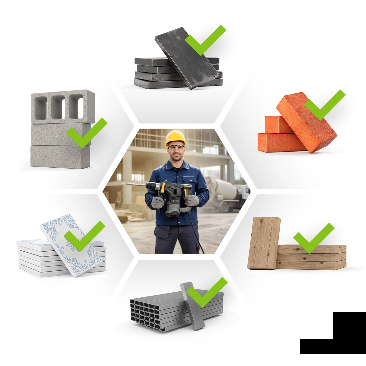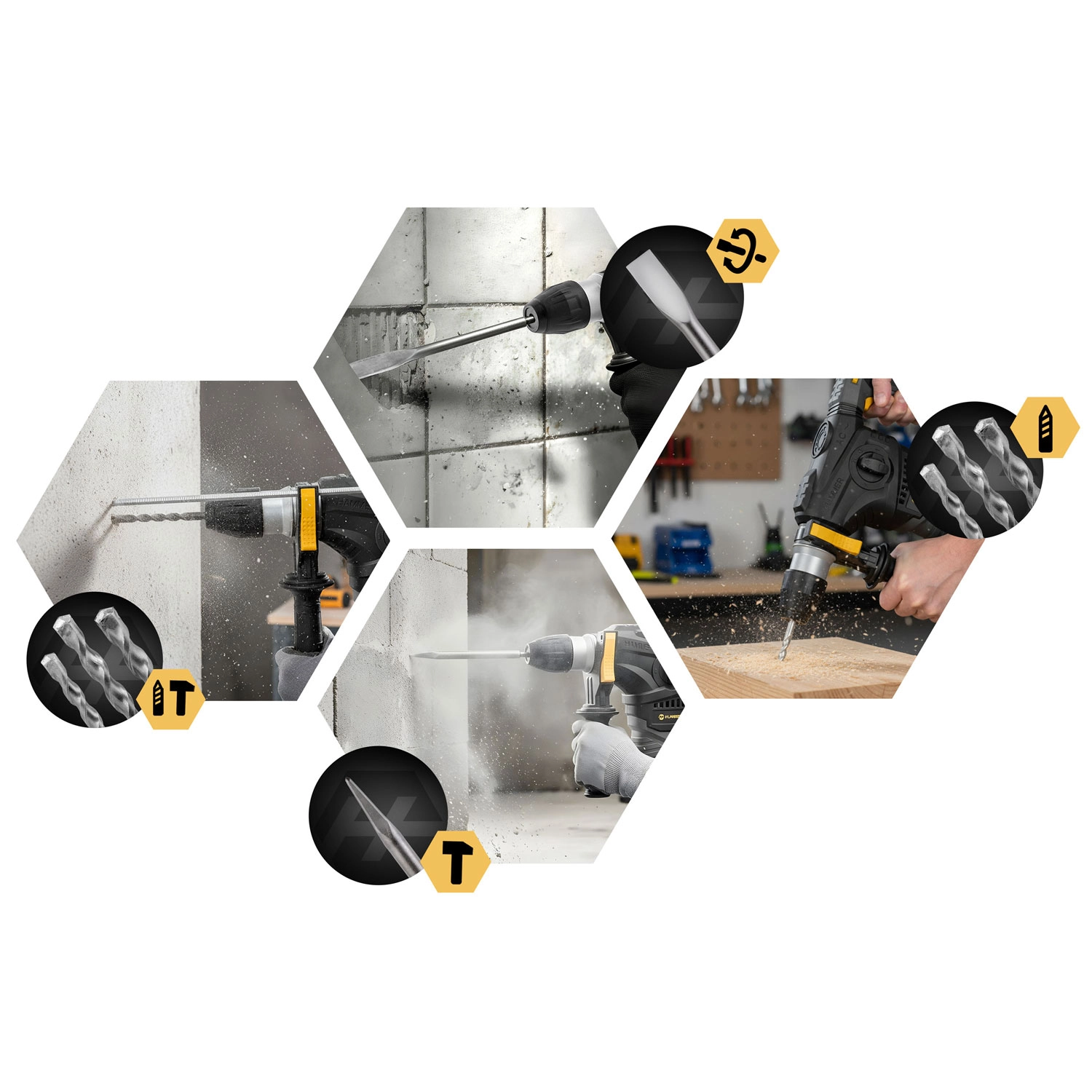 • Contrôle et précision : réglage de vitesse à 6 niveaux, verrouillage du burin, perçage précis dans le béton, la maçonnerie, le bois et le métal