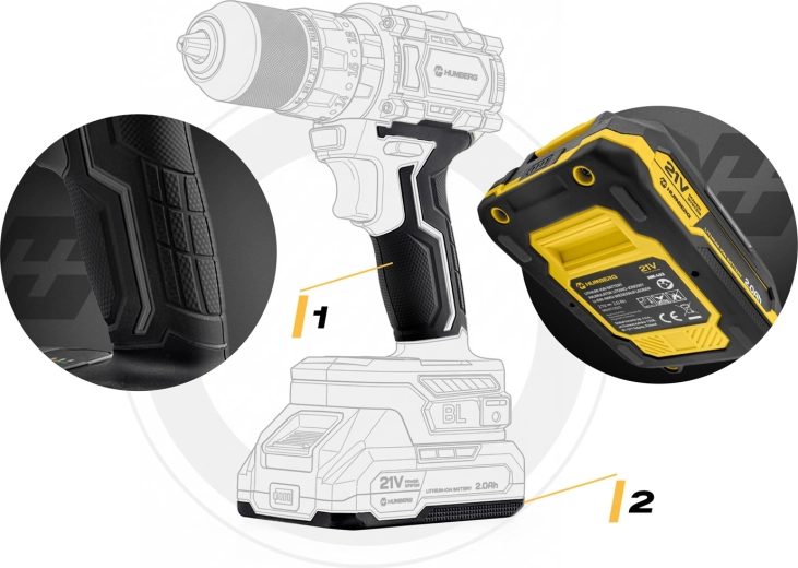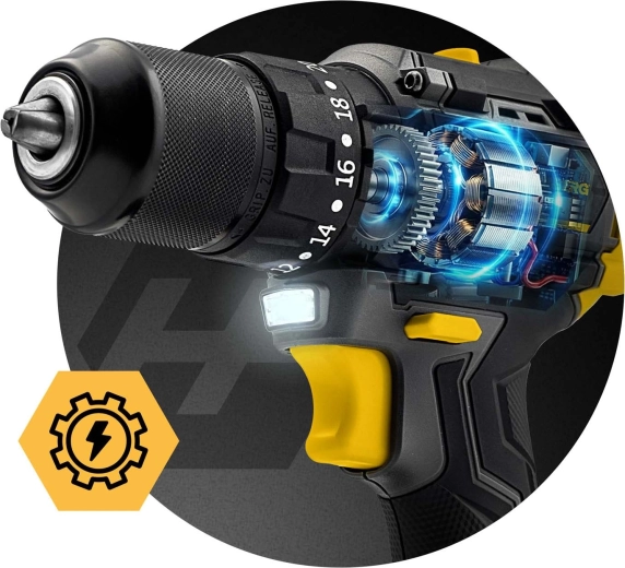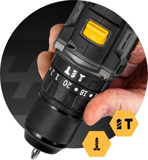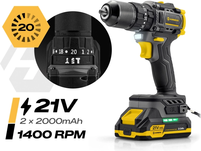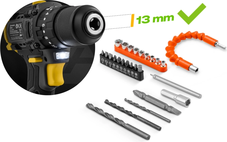 La conception ergonomique avec poignée souple antidérapante assure assurance et confort même lors de travaux prolongés. La réglage d’embrayage à 20 positions protège le matériau et les vis, les deux vitesses permettent de basculer entre le vissage précis (0–400 tr/min) et le perçage rapide (0–1400 tr/min). La lumière LED éclaire la zone de travail dans les recoins sombres, les armoires ou les plafonds.