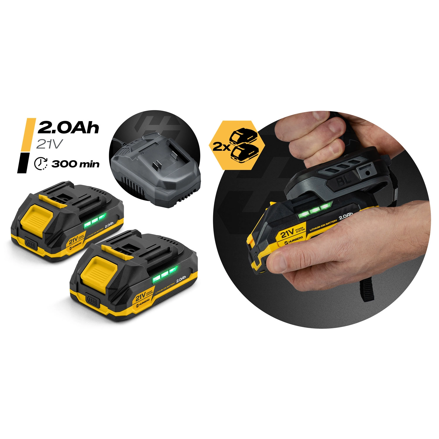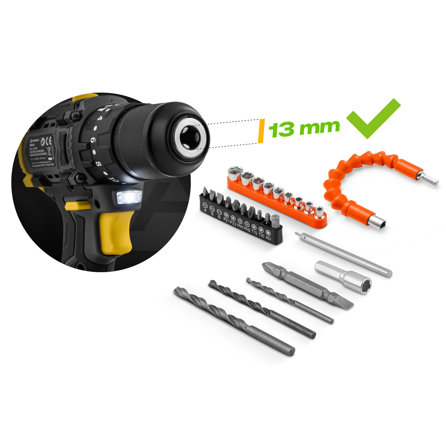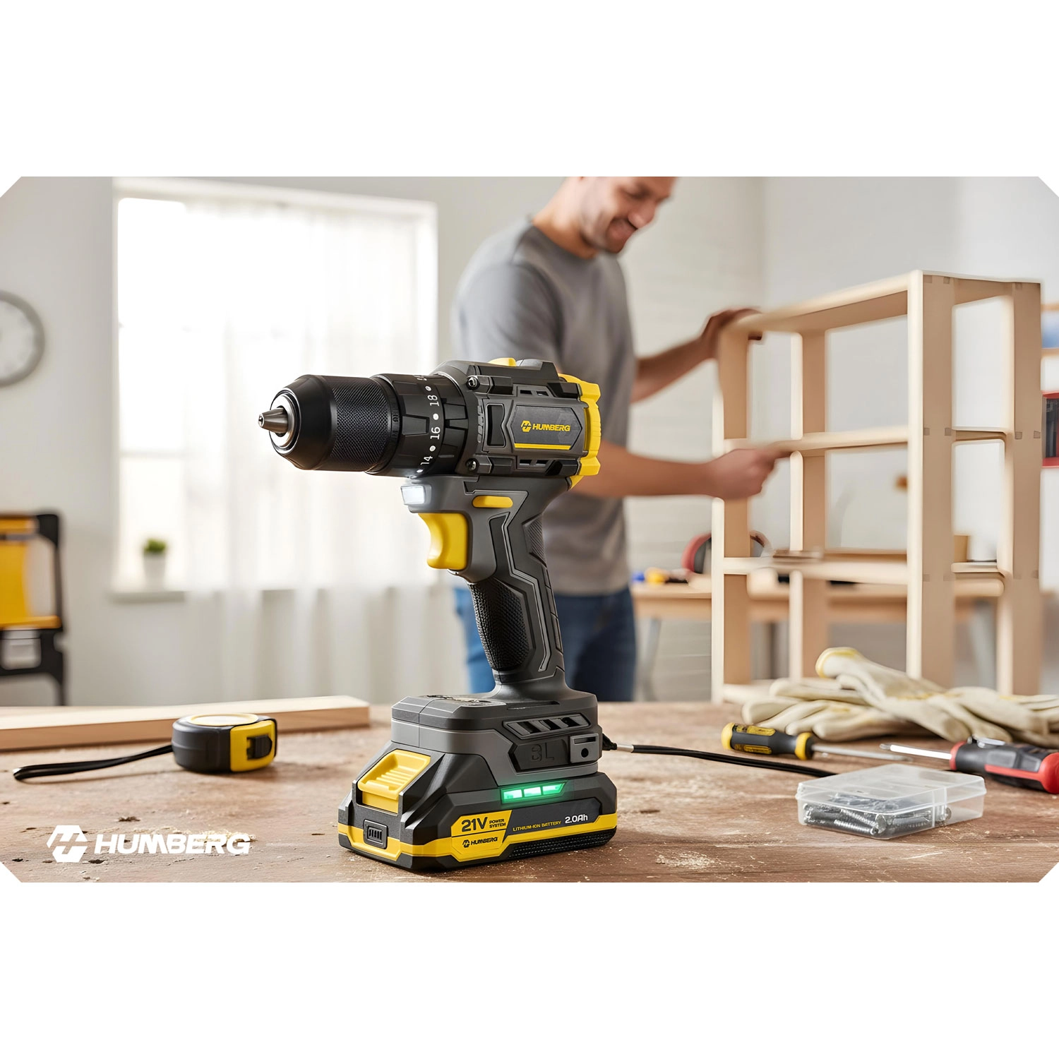 Cette perceuse à percussion sans fil maîtrise le vissage précis, le perçage rapide et le perçage à percussion dans des matériaux plus durs. Le moteur sans balais apporte un meilleur rendement, une durée de vie prolongée et un fonctionnement fluide sans à-coups. Grâce aux deux batteries 21 V 2 Ah, vous pouvez travailler sans interruption – while l’une se recharge, vous utilisez l’autre.
