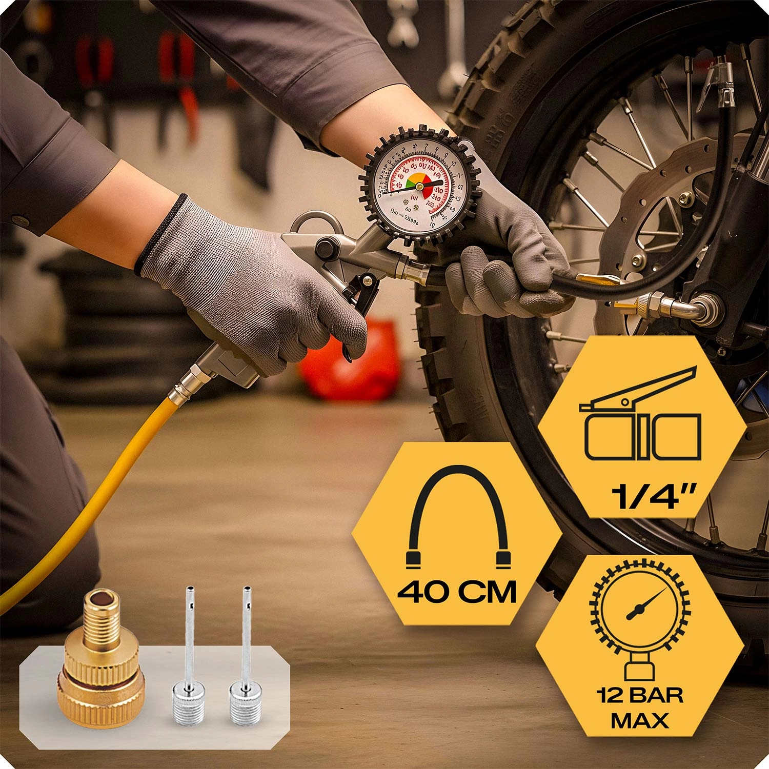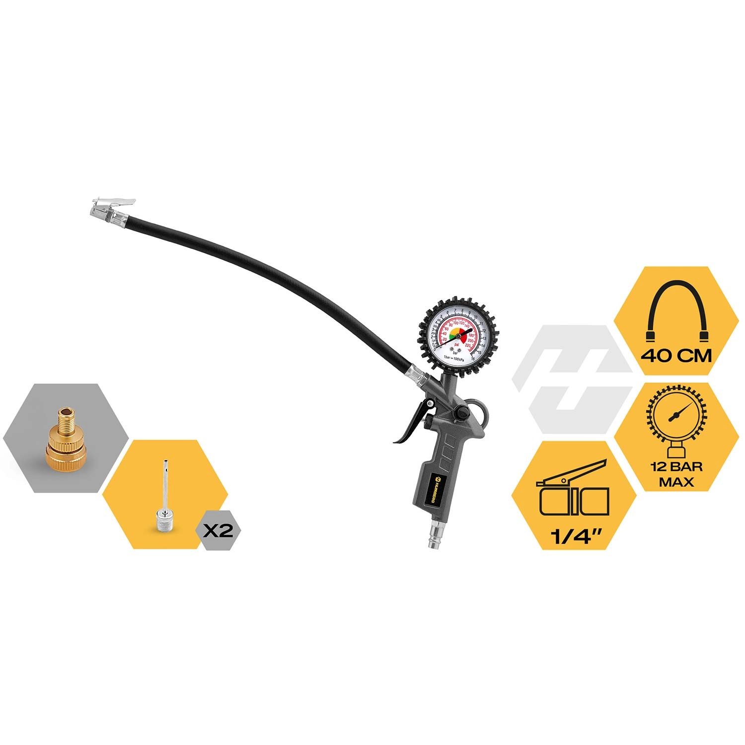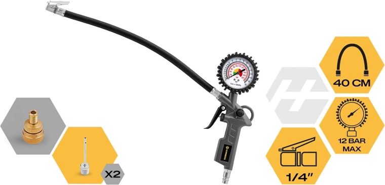 Ce kit richement équipé offre des résultats professionnels à la maison comme à l’atelier. Le pistolet de gonflage avec manomètre permet un contrôle précis de la pression, le flexible élastique de 40 cm facilite l’accès aux zones difficiles et le raccord standard 1/4" assure la compatibilité avec la plupart des compresseurs. Sont également inclus des embouts pour ballons de sport et un raccord rapide pour une connexion rapide et étanche.