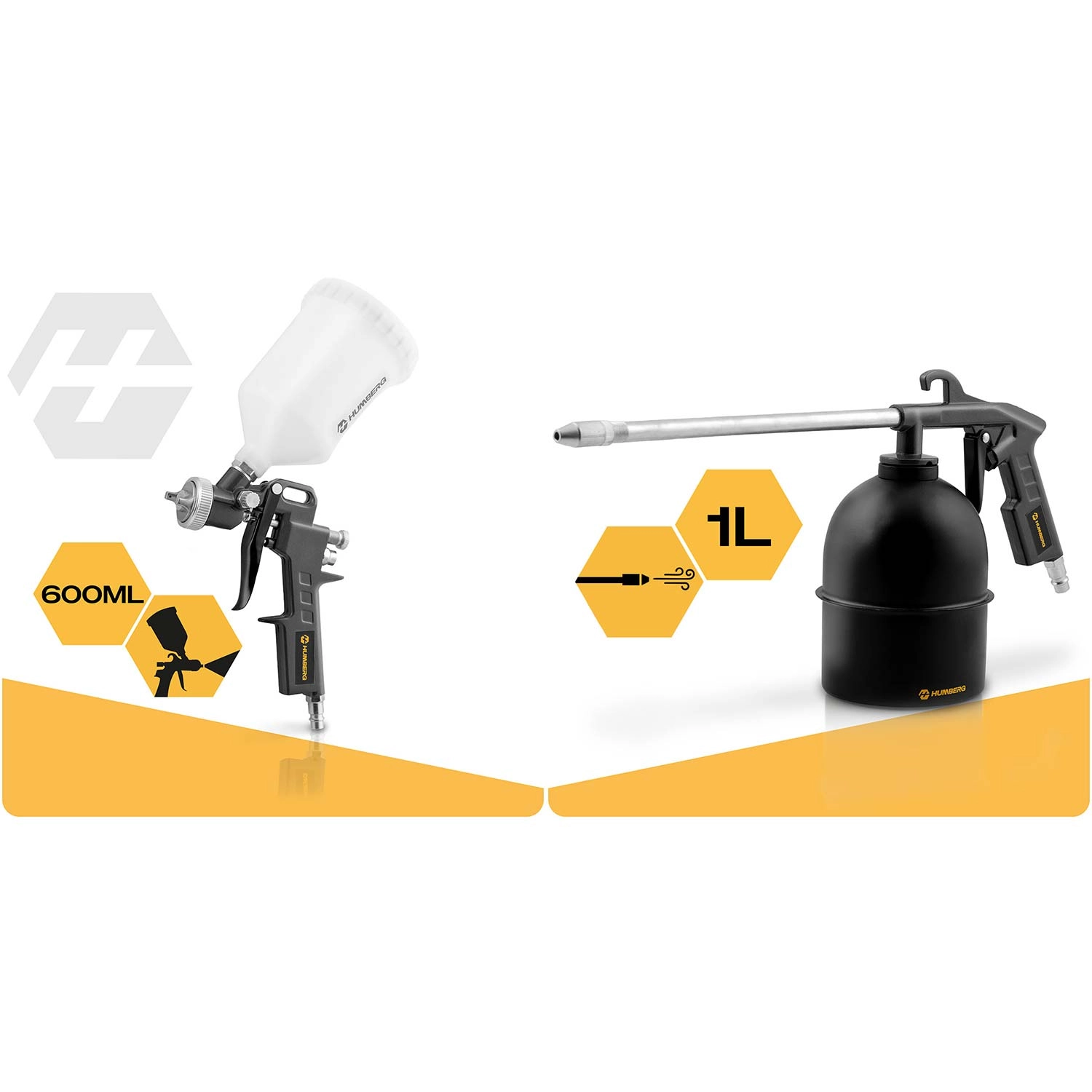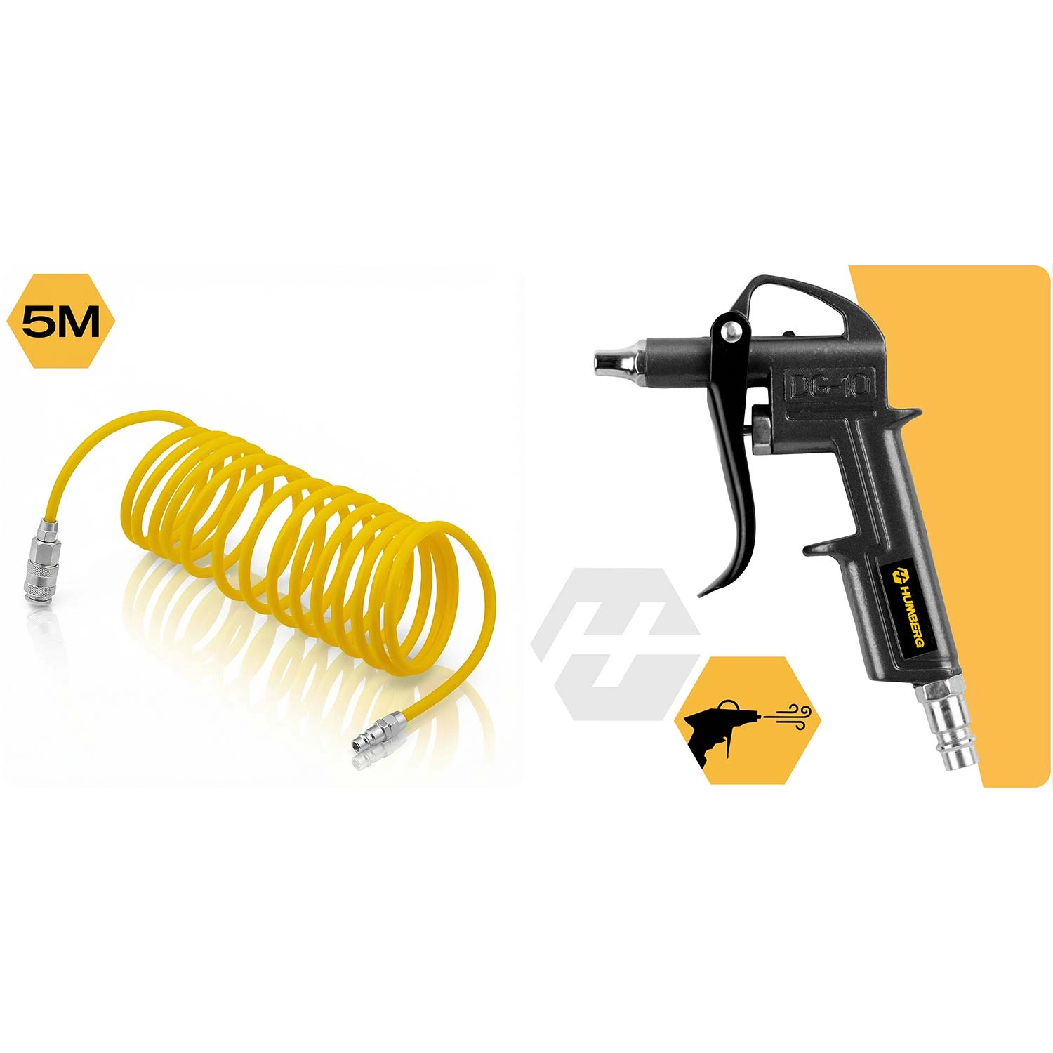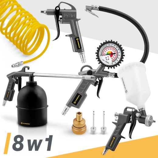 Le kit d’outillage pneumatique 8 en 1 universel pour compresseurs HUMBERG gère le gonflage des pneus, la peinture, le soufflage, le nettoyage ainsi que le lavage haute pression. Il comprend un pistolet de gonflage avec manomètre, un pistolet de peinture et un pistolet d’application/traitement, un pistolet de soufflage, un tuyau spiralé 5 m, un raccord rapide et des embouts – tout pour un travail rapide et précis à l’atelier comme au garage.
