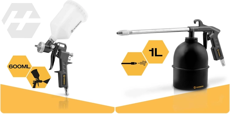 Le pistolet de soufflage avec poignée ergonomique et buse fine est idéal pour nettoyer la poussière, les copeaux et les sciures. Deux buses allongées différentes augmentent la précision selon les besoins. Le pistolet de peinture avec réservoir 600 ml offre un réglage du débit et de la forme du jet pour une application uniforme sans coulures, adapté aux pièces de carrosserie, au mobilier et au métal.