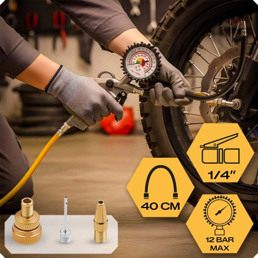 La pistolet avec manomètre analogique rond permet de gonfler les pneus confortablement avec un contrôle instantané de la pression. Le tuyau flexible et l’embout fiable assurent une connexion sûre à la valve.