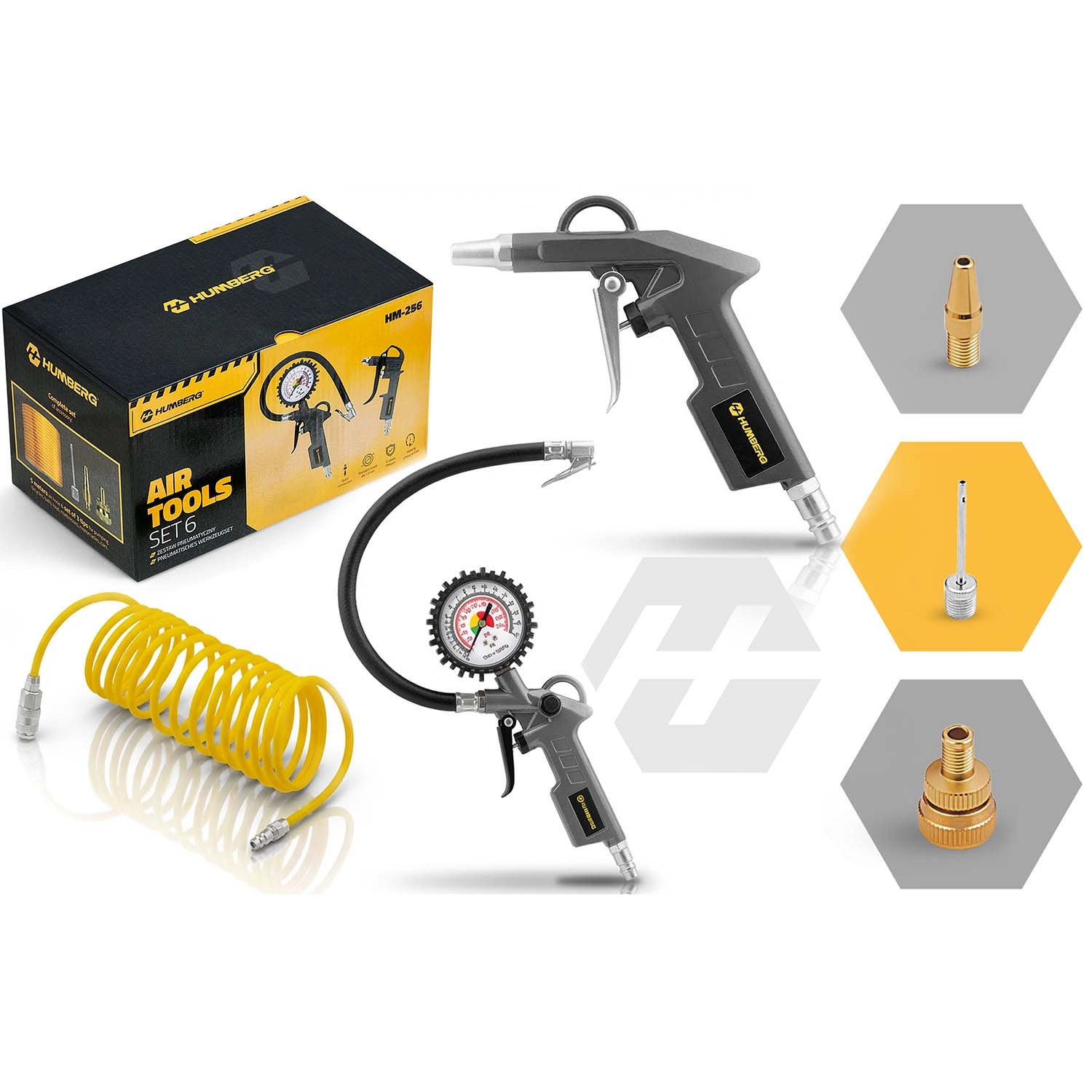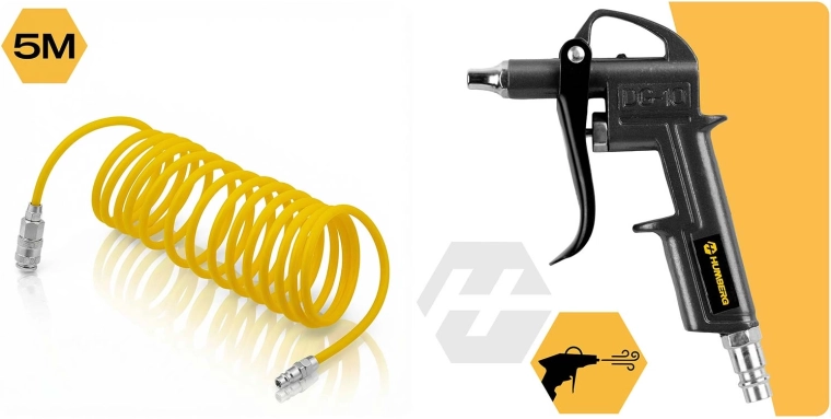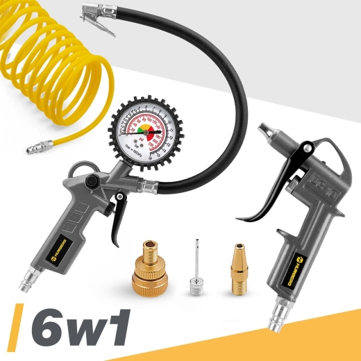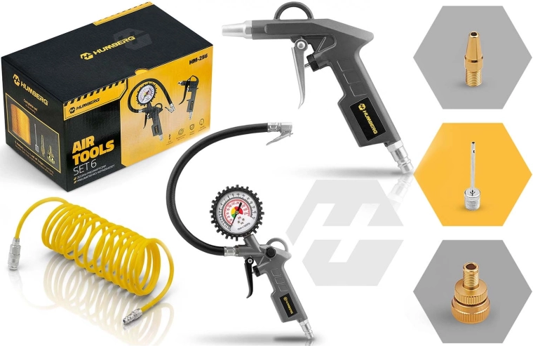 Le kit universel d’outillage pneumatique 6 en 1 pour compresseur HUMBERG vous permet de gonfler les pneus, souffler et nettoyer, laver sous pression et réaliser d’autres travaux à l’atelier ou au garage. Il comprend une pistolet avec manomètre, une pistolet de soufflage, un tuyau spiralé de 5 m, un jeu d’embouts et un raccord rapide pour une connexion instantanée. Économisez du temps et de l’argent et travaillez comme dans un service professionnel.