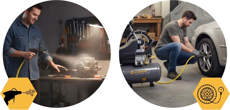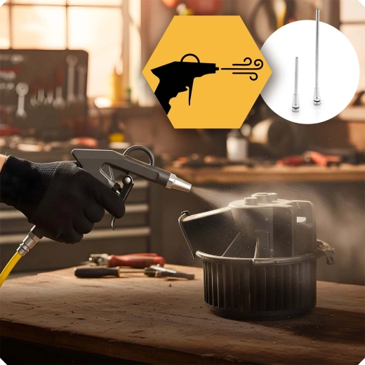 - Nettoyage et maintenance : la pistolet de soufflage élimine poussière, copeaux et débris des zones difficiles d’accès.
