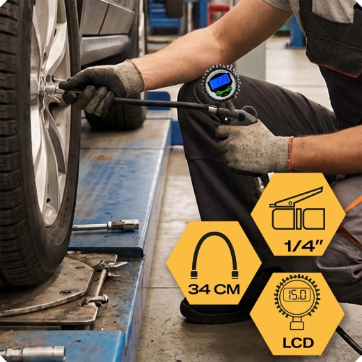 Le tuyau flexible de 34 cm accroît le confort de travail et le raccord 1/4" standard assure une large compatibilité avec les compresseurs d’atelier comme domestiques. Le pourtour en caoutchouc résistant du manomètre protège l’appareil contre les chocs, ce qui le rend idéal pour le garage, l’atelier et les déplacements.