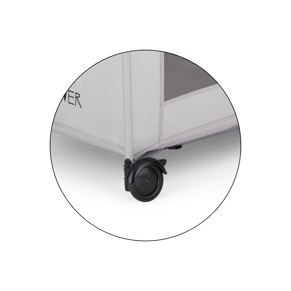 Le lit se plie rapidement et facilement à un format compact. Deux roulettes facilitent les déplacements dans la pièce, tandis que la fermeture zippée frontale permet aux enfants plus grands d’entrer et de sortir en toute sécurité. Le pack comprend une surface de couchage pliante et un sac de transport pour voyager sereinement. Pour les nouveau-nés, il est possible d’acheter un niveau additionnel pour une position de couchage plus haute.