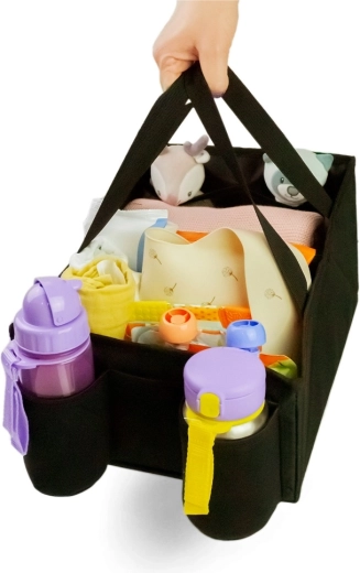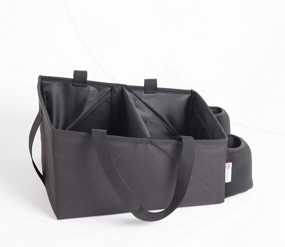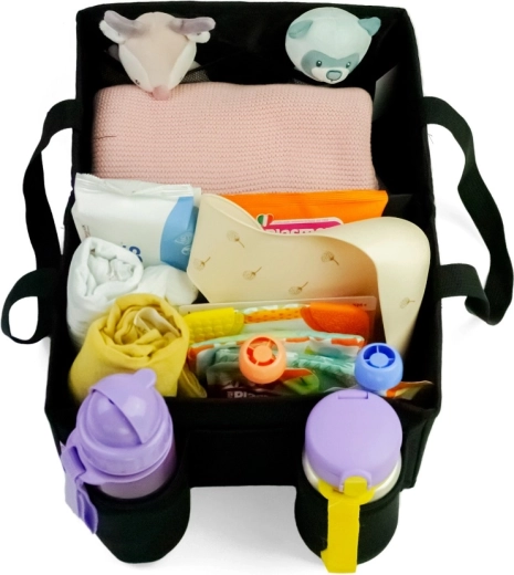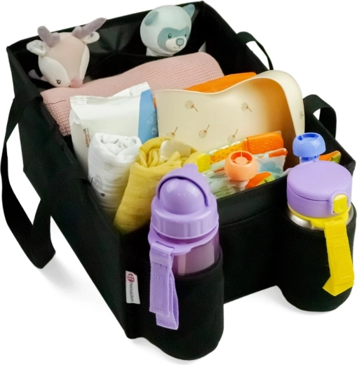 Le grand espace intérieur, divisé en 2 compartiments et complété par des poches en maille, garde jouets, couches, goûters et lingettes parfaitement organisés.