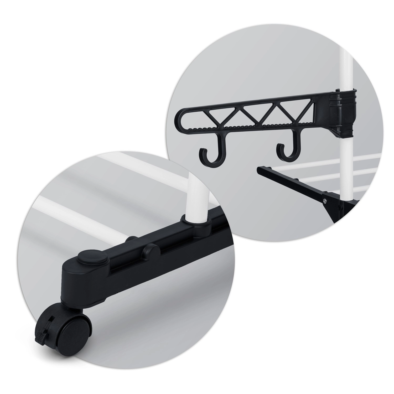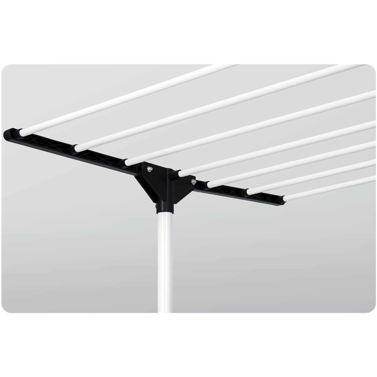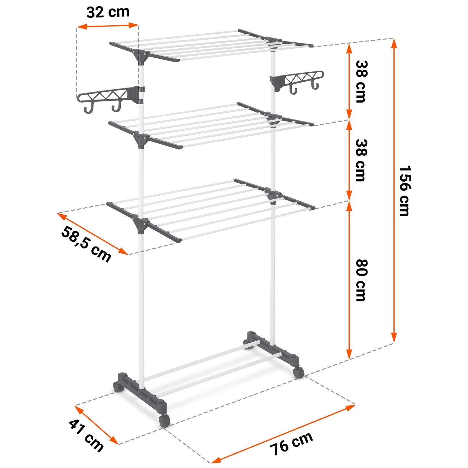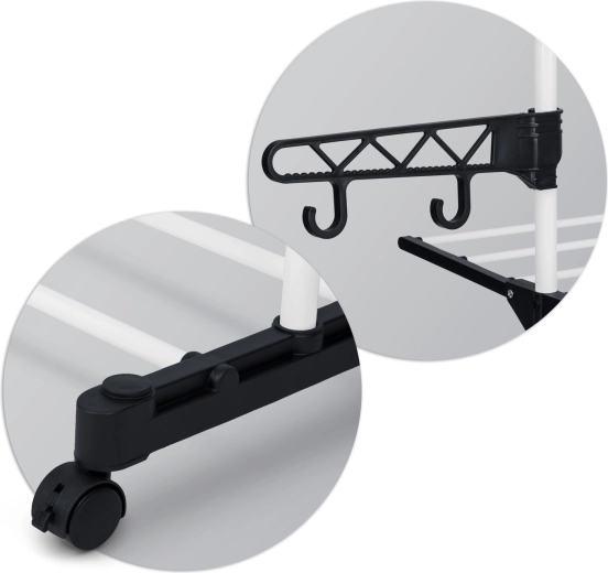Six niveaux rabattables offrent un séchage flexible, des t-shirts aux serviettes. Les barreaux élargis limitent la formation de plis, rendant souvent le repassage superflu. Des crochets latéraux et des ouvertures pour cintres et petite lingerie libèrent de la place sur les niveaux principaux. Grâce aux espaces intelligemment pensés entre les tiges, l’air circule librement et le linge sèche rapidement et uniformément.