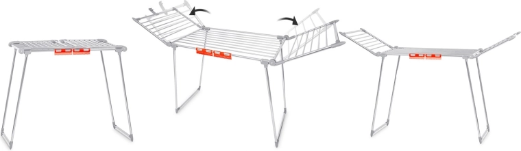 Le séchoir se transporte facilement, se plie rapidement en un format compact et, grâce à ses pieds antidérapants, reste bien en place aussi bien à l’intérieur que sur le balcon. Les pinces et supports intégrés pour les petits articles libèrent de l’espace sur les tiges principales et augmentent la capacité totale. Sa structure en acier inoxydable garantit une longue durée de vie et un entretien facile.