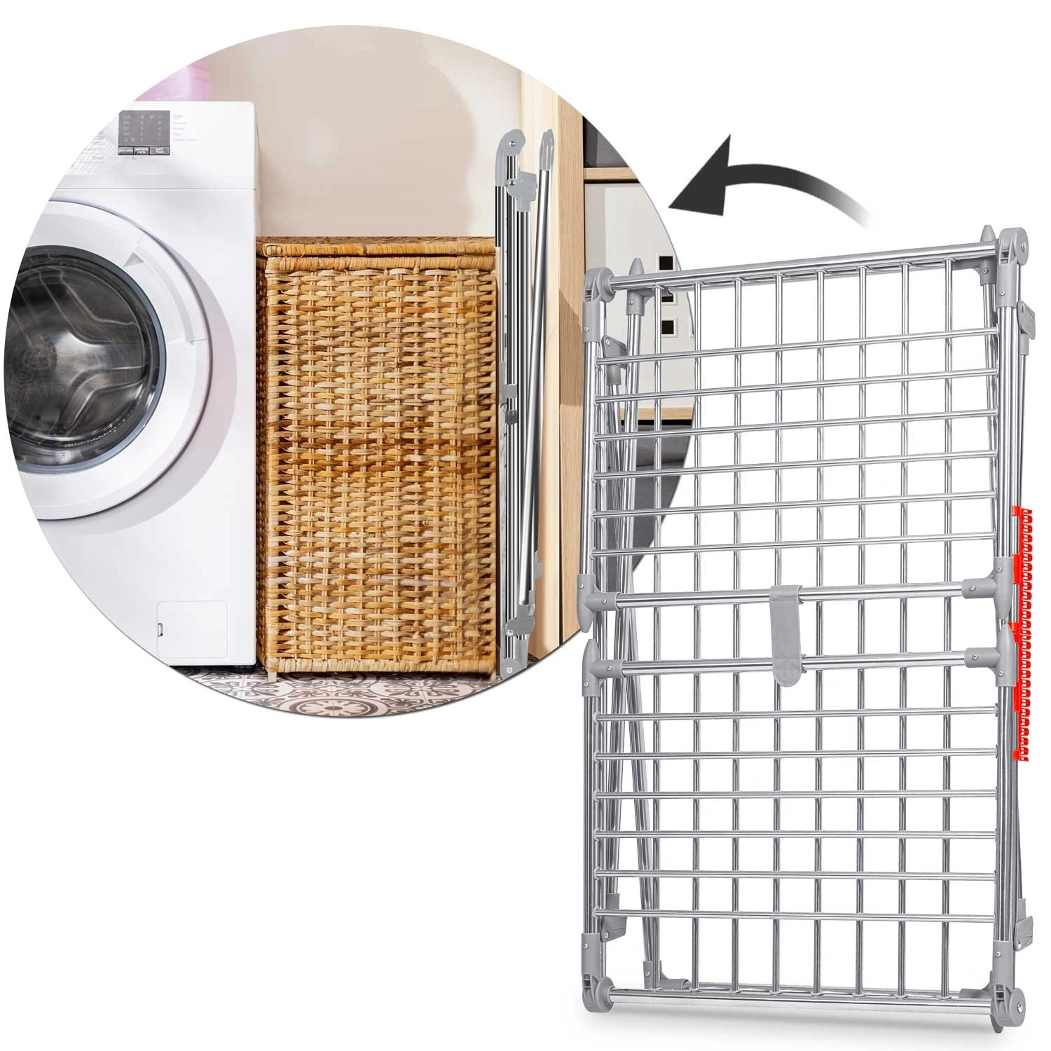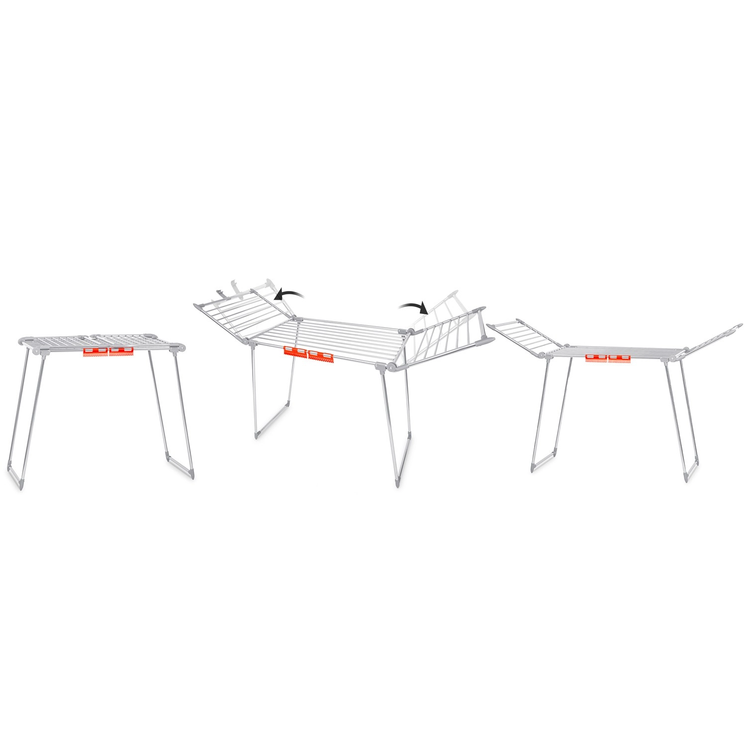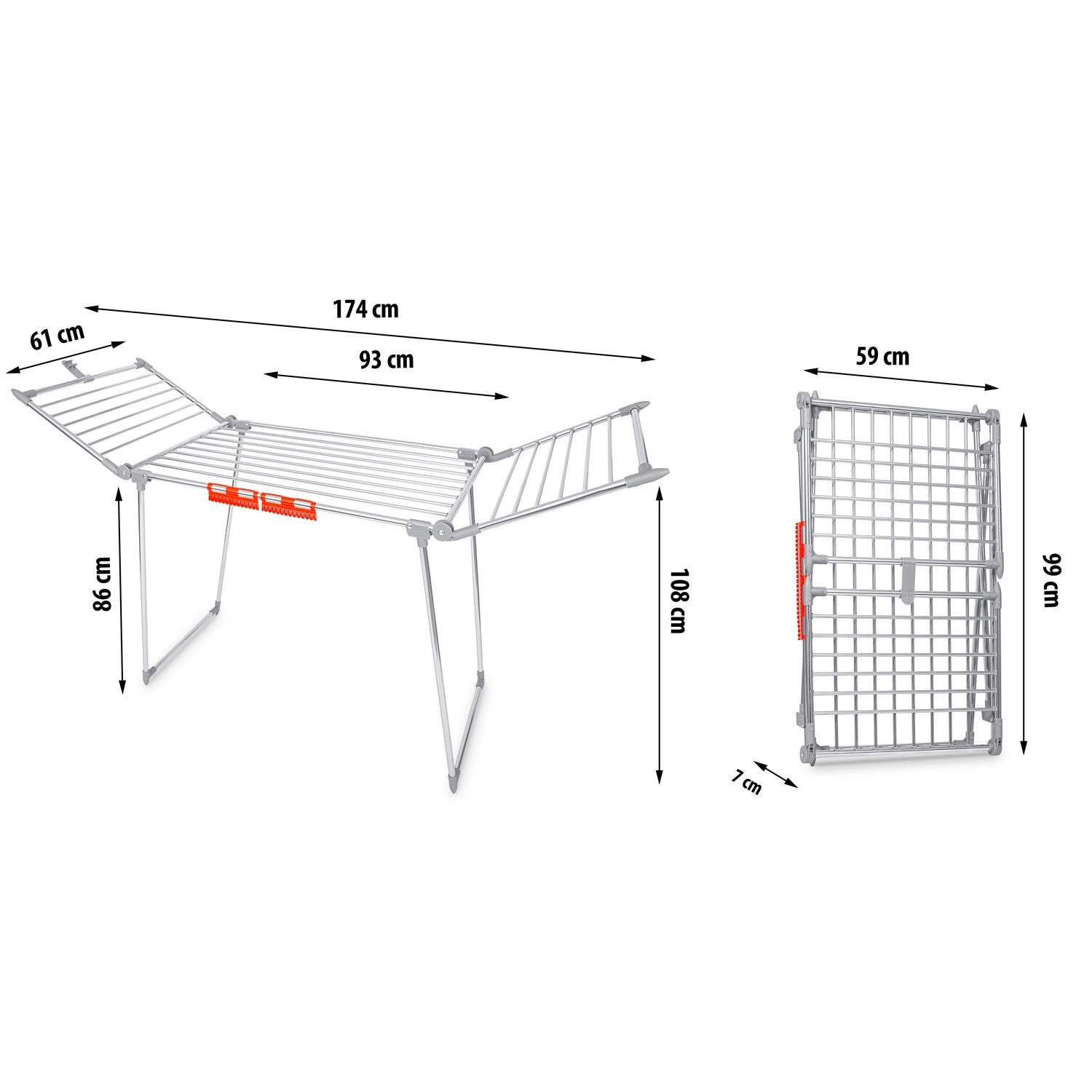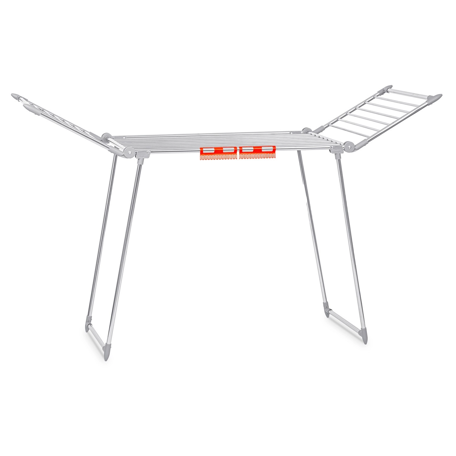 Pratique séchoir à linge pliant en acier inoxydable avec une capacité de séchage de 19 m et deux ailes rabattables pour un espace supplémentaire. Il dispose de porte-linge pour petits articles (chaussettes, sous-vêtements), d’une structure métallique stable et de pieds antidérapants. Grâce à des barreaux plus épais, il réduit les plis superflus et le linge sèche plus vite et de manière uniforme. Un pliage et dépliage simples et rapides permettent de gagner de la place dans chaque foyer.