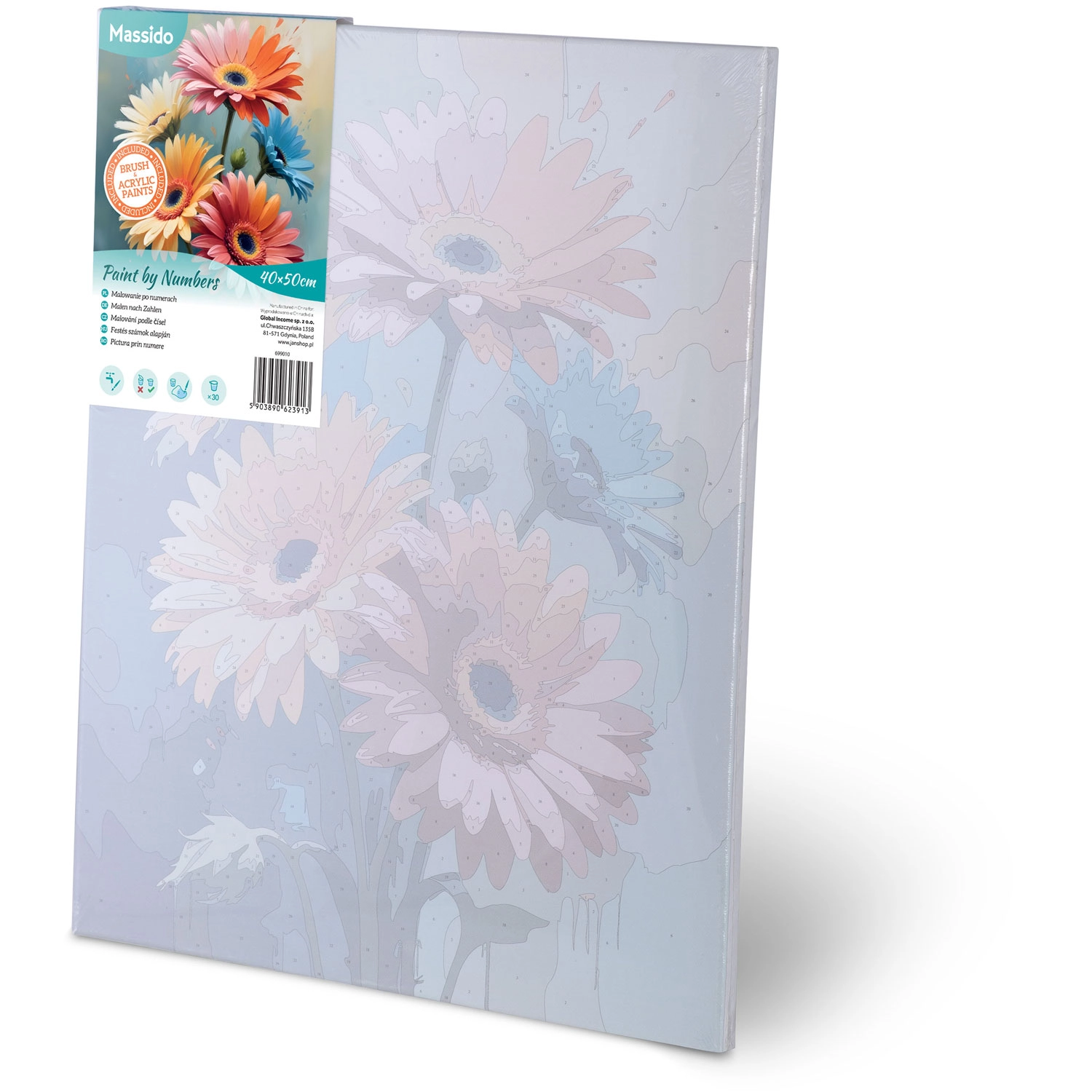 Toile apprêtée 40 × 50 cm sur châssis, jusqu’à 30 peintures acryliques intenses et trois pinceaux (1 mm, 2 mm, 7 mm) pour les détails et les aplats – vous pouvez commencer à peindre tout de suite.