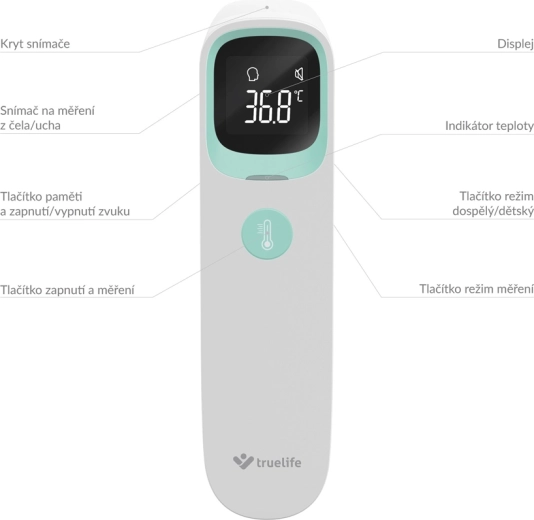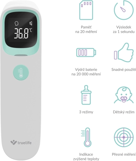 Mesure rapide et hygiénique sans contact en une seconde. TRUELIFE Care Q9 offre 3 modes (front, oreille, objets/liquides), une précision de ±0,1 °C, un indicateur coloré de fièvre, une mémoire de 20 mesures et une autonomie jusqu’à 20 000 mesures. Vous apprécierez la commande simple à un seul bouton et l’écran LCD rétroéclairé à la maison comme en voyage.