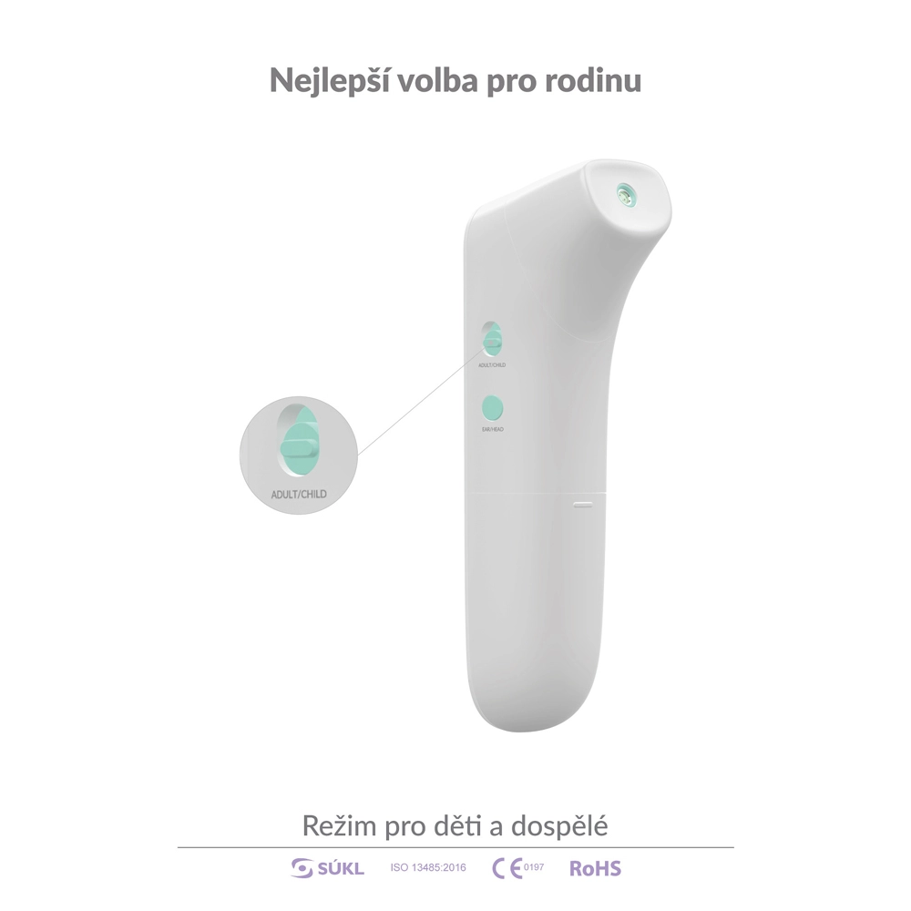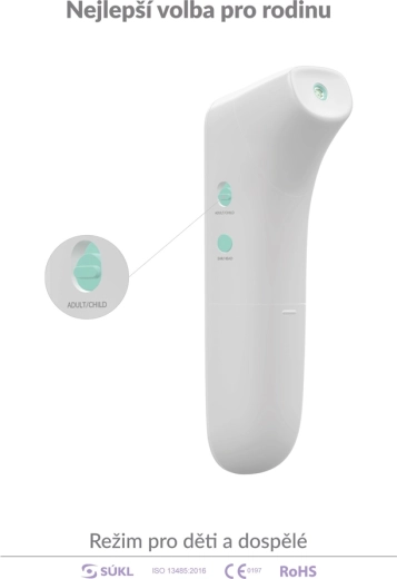 Pour les familles avec enfants, un mode enfant est prévu pour les moins de 12 ans. La mesure est totalement hygiénique et confortable – il suffit de viser à une distance de 1 à 3 cm et d’appuyer sur l’unique bouton. Le thermomètre mémorise les 20 dernières valeurs et, grâce à son fonctionnement économe, effectue jusqu’à 20 000 mesures avec une seule paire de piles.