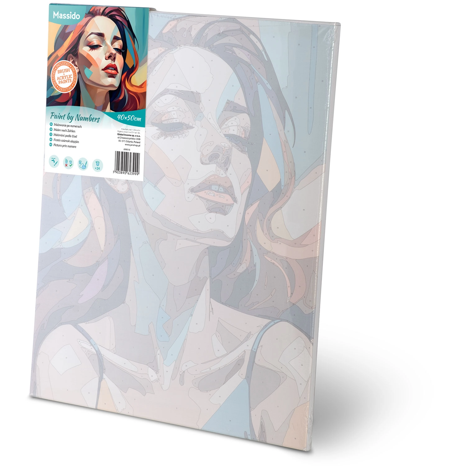 Libérez votre créativité avec le kit premium MASSIDO. Une toile de qualité tendue sur châssis en bois, avec des zones pré-imprimées et numérotées, vous guide étape par étape. Il suffit d’associer les numéros aux couleurs et de voir naître devant vous un portrait de femme vif et moderne aux couleurs marquées et aux lignes nettes.