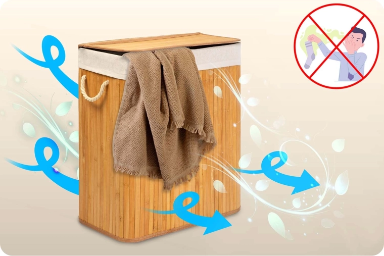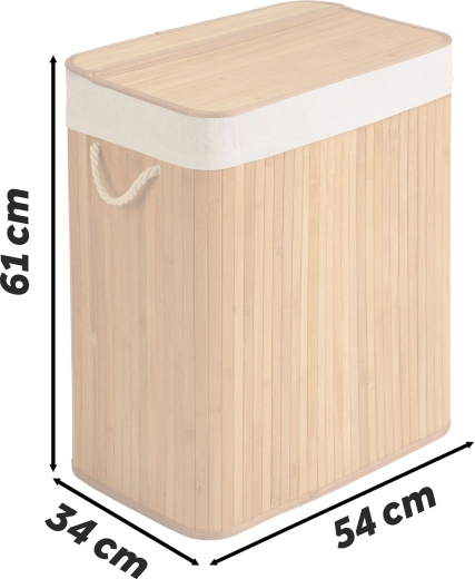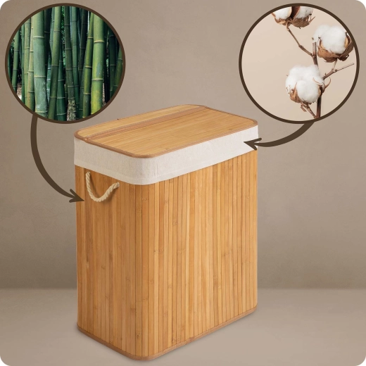 Les matériaux naturels – bambou et coton – favorisent la respirabilité et aident à limiter l’humidité et les odeurs. Le sac en coton amovible se retire facilement, se serre avec un cordon et se porte directement jusqu’à la machine. Un couvercle pratique, des poignées en corde robustes et un fond stable assurent une longue durée de vie et une manipulation aisée.