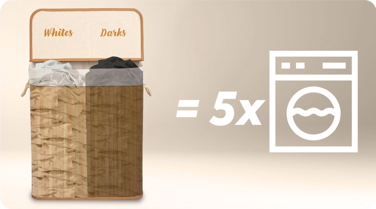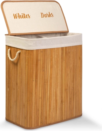 Le panier à linge à deux compartiments en bambou naturel facilite le tri quotidien : au moment de déposer le linge, séparez-le directement en Lights et Darks. Grâce à son grand volume de 100 L, il peut contenir le linge de plusieurs lessives et garder la salle de bain ou la chambre nette et ordonnée.