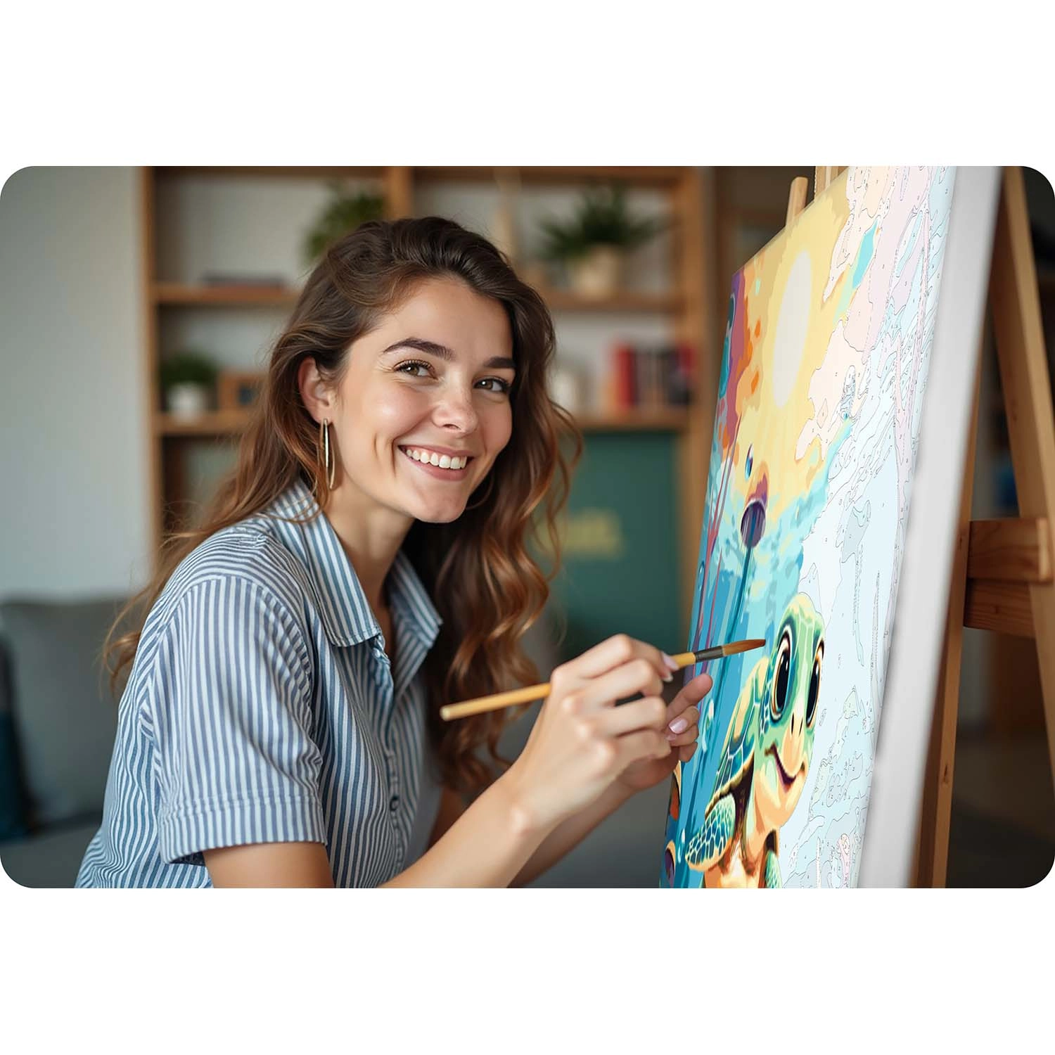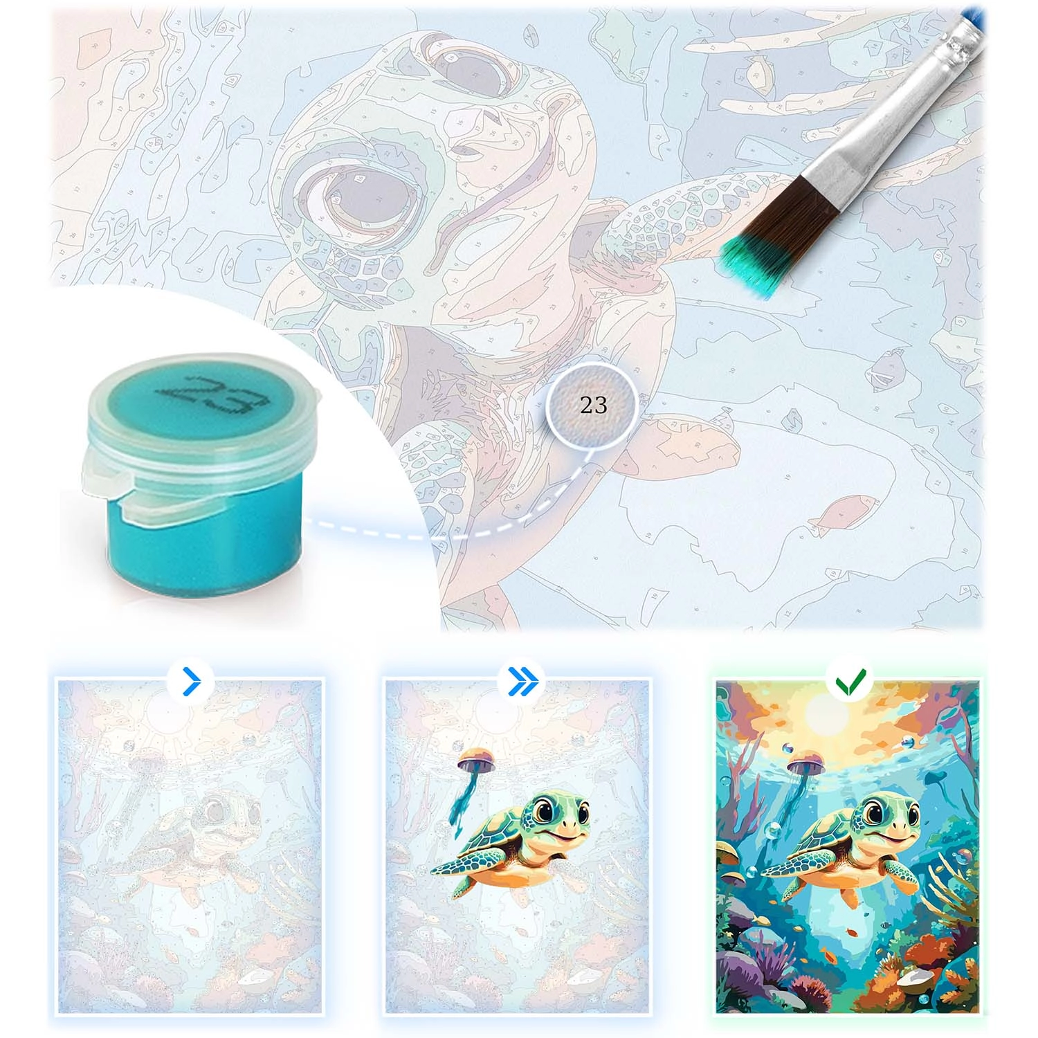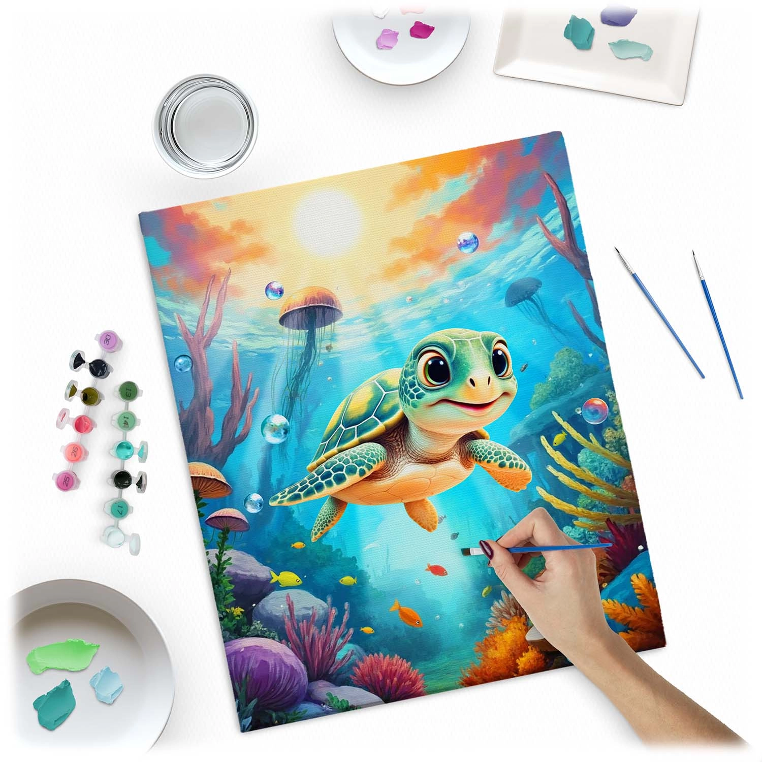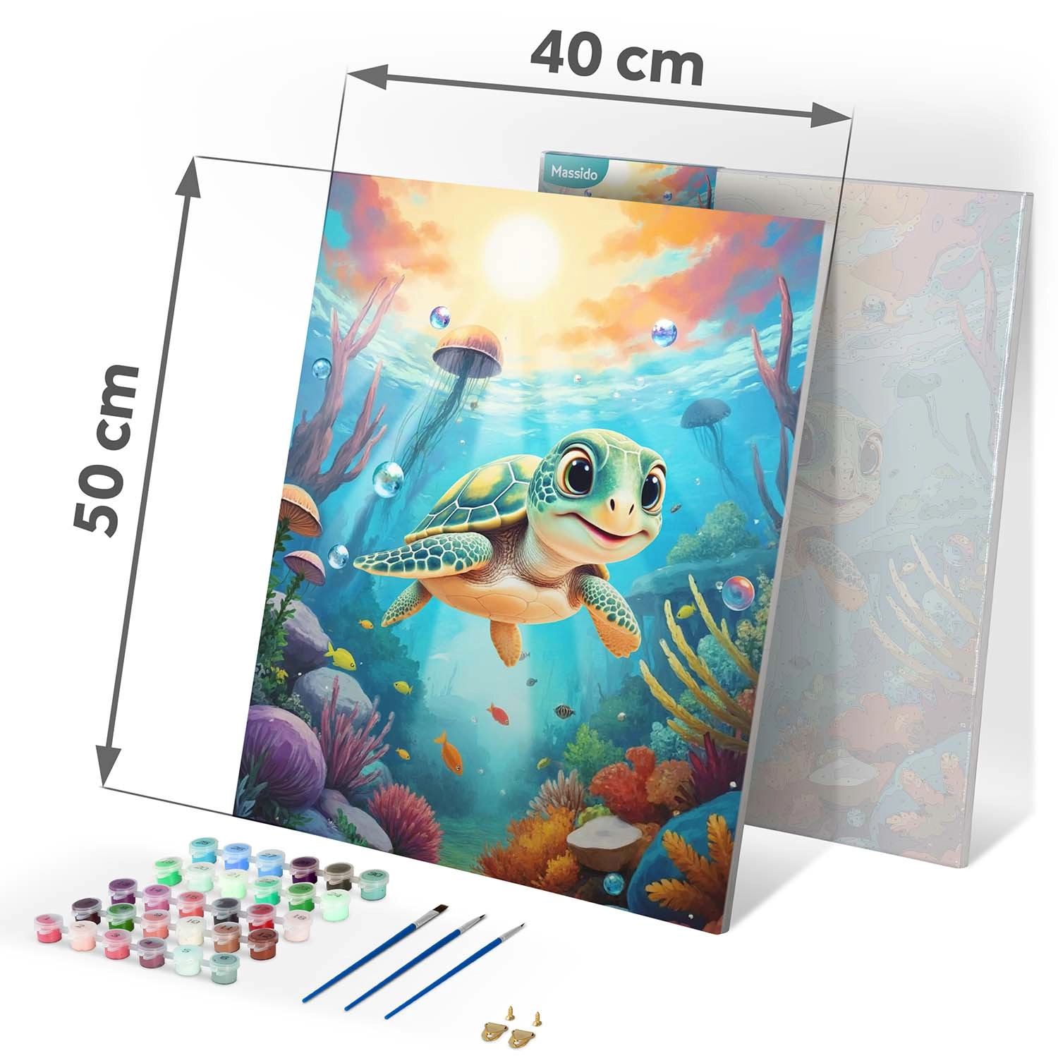 Découvrez la joie de créer avec le kit 40×50 cm de peinture par numéros de Massido – un adorable motif de petite tortue sous la mer, une toile sur châssis de qualité, jusqu’à 30 peintures opaques, 3 pinceaux et des crochets de suspension. Idéal pour débutants comme avancés, pour une relaxation créative ou un cadeau haut en couleurs.