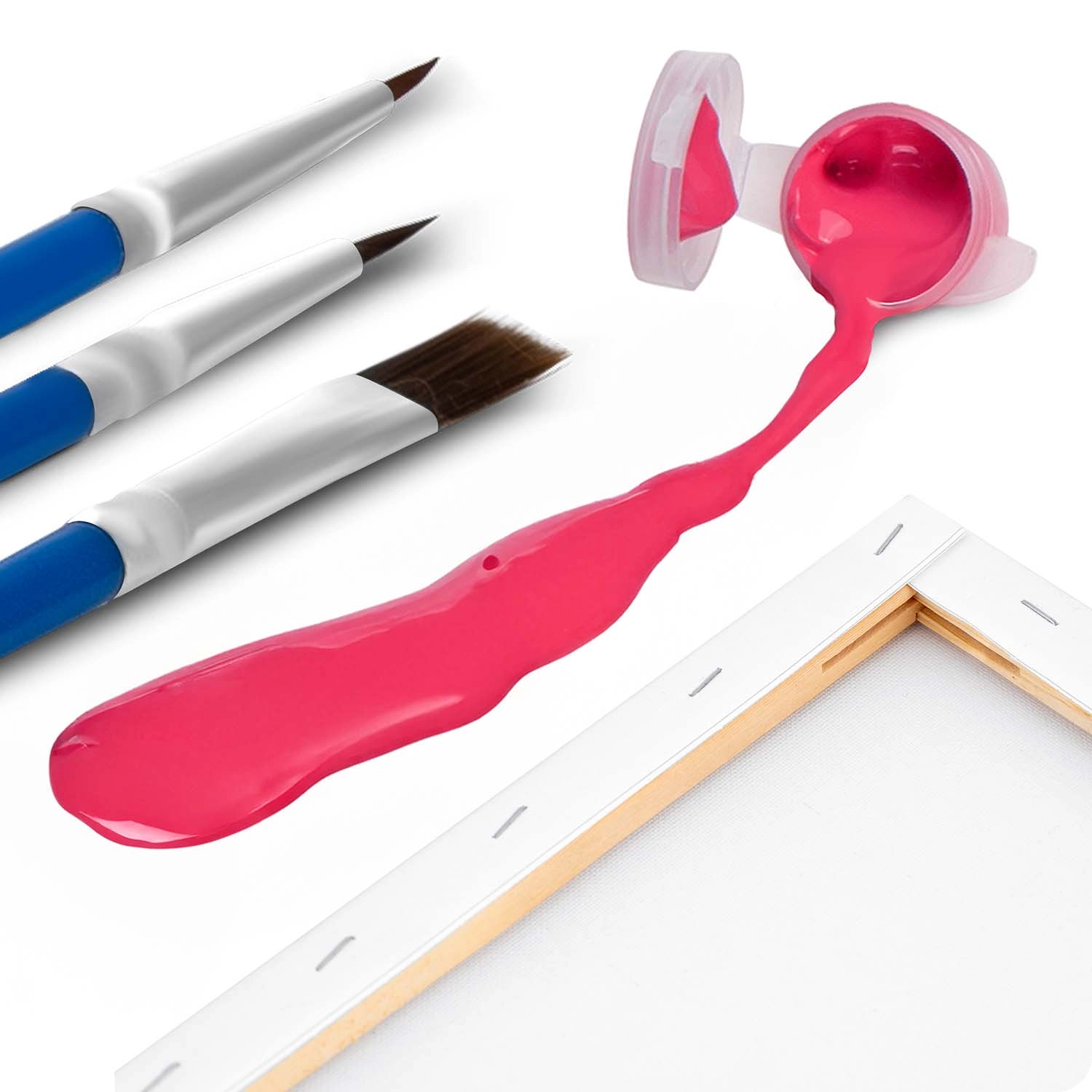 Le set complet comprend une toile tendue avec modèle, 30 peintures acryliques opaques et 3 pinceaux – vous pouvez commencer à peindre dès l’ouverture.