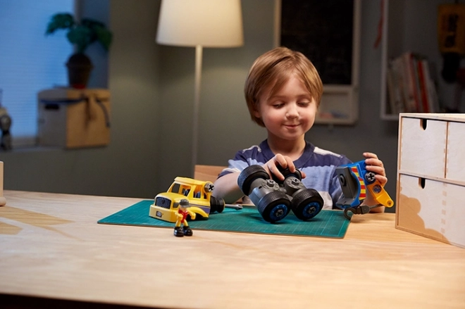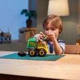 La dépanneuse jaune avec des pièces fonctionnelles est idéale pour les premiers vissages. Les enfants entraînent leur coordination puis partent aussitôt secourir les voitures en panne.