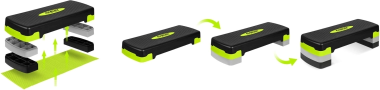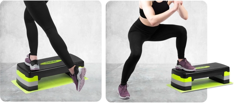 Le step est parfait pour brûler des calories, sculpter les jambes et les fessiers, mais aussi pour renforcer les bras et le tronc (dips, pompes, planche). Grâce à ses dimensions compactes et à la possibilité de ranger les réhausses sous la plateforme, il se stocke facilement même dans un petit appartement. Le tapis antidérapant inclus améliore l’adhérence et protège votre sol.