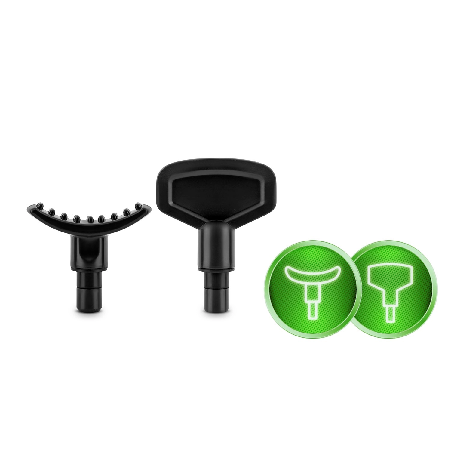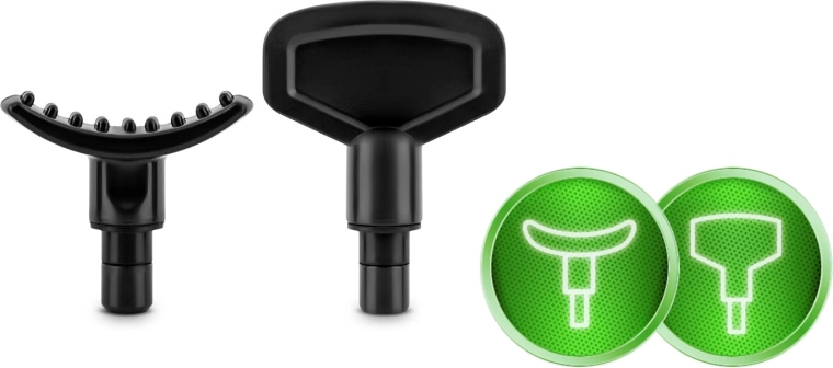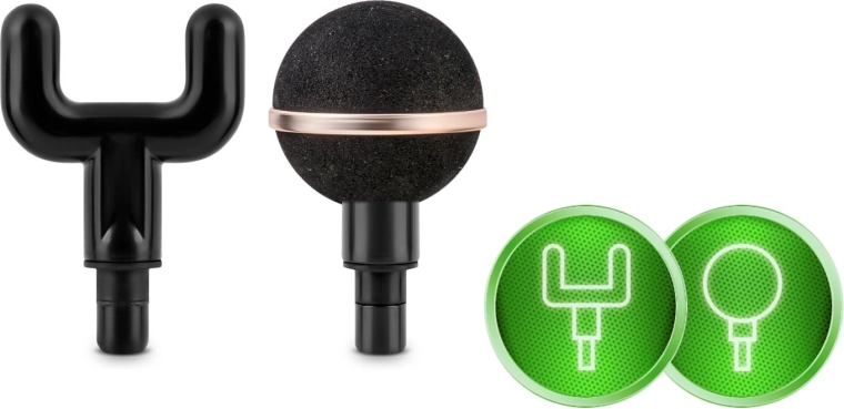 Fourche pour la zone de la colonne vertébrale et du tendon d’Achille, boule pour les gros muscles, plate pour les tissus denses, projectile pour la pression ponctuelle et d’autres embouts spécialisés.