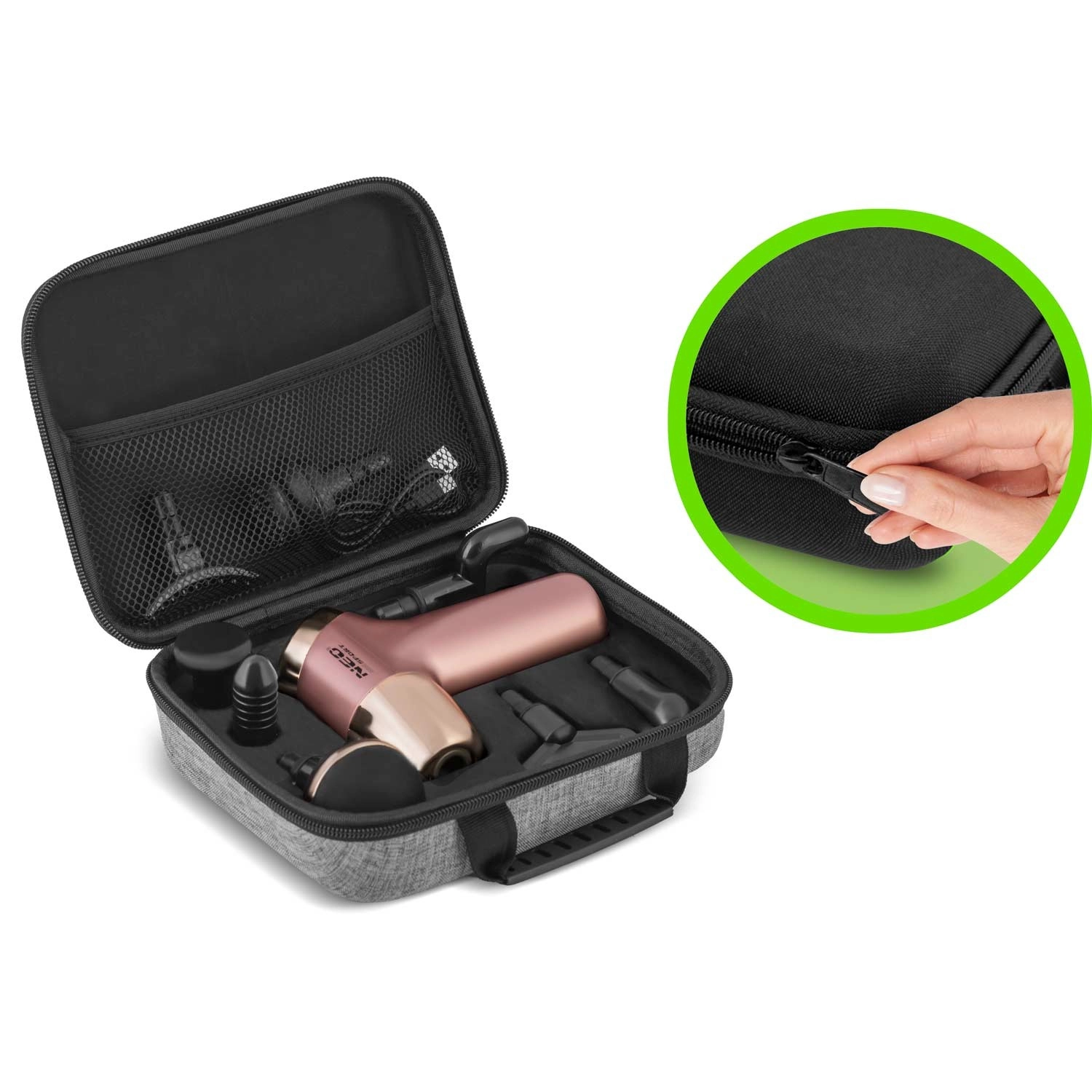 L’ensemble comprend 8 embouts spécialisés pour différentes zones musculaires, un élégant étui de voyage en tissu et un câble de charge USB‑C. L’écran LCD permet de suivre facilement la vitesse et l’état de la batterie. Un système de sécurité protège le moteur contre la surcharge et éteint automatiquement l’appareil en cas de pression excessive.