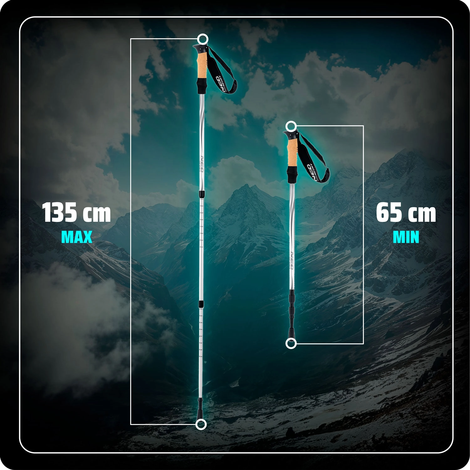 Les bâtons de trekking NEO-SPORT NS-380 sont conçus pour des conditions exigeantes – des sentiers montagneux caillouteux aux trottoirs enneigés. Grâce à la construction télescopique, ils s’adaptent facilement à votre taille et au terrain, tandis que le ANTYSHOCK ménage les articulations et les muscles lors des longues montées comme des descentes. Les poignées en liège ergonomiques assurent une prise sûre sans glissement et un confort par temps chaud comme froid.
