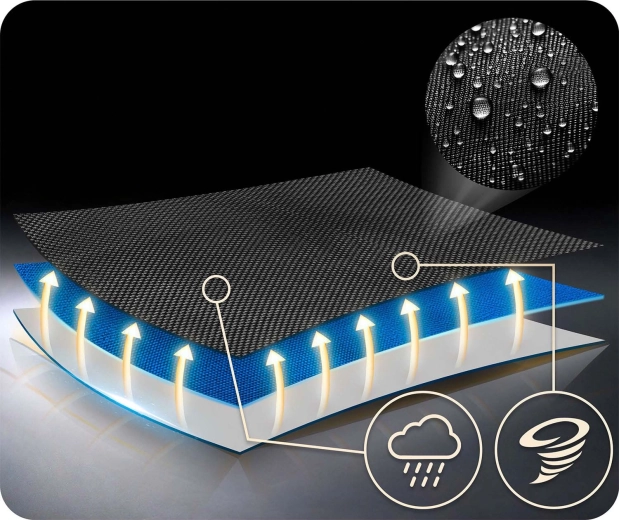 Textile résistant qui supporte la pluie et un usage intensif, conserve sa forme et ses couleurs, et se nettoie en un instant.