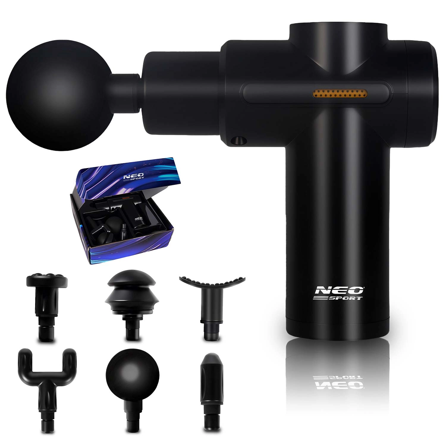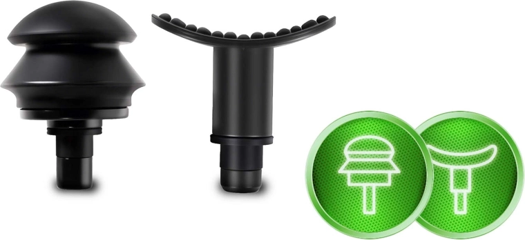 La boîte contient 6 embouts interchangeables : tête ronde pour les grands groupes musculaires, fourche en U autour de la colonne et des tendons, tête plate à reliefs pour une stimulation plus large, « projectile » pour une pression profonde et précise, « champignon » souple pour les zones sensibles et une tête incurvée à reliefs idéale pour les pieds et les mollets. Tous les embouts sauf la tête ronde peuvent être utilisés avec de l’huile de massage (veillez à ce que l’huile ne pénètre pas à l’intérieur de l’appareil ni sur la partie de fixation).