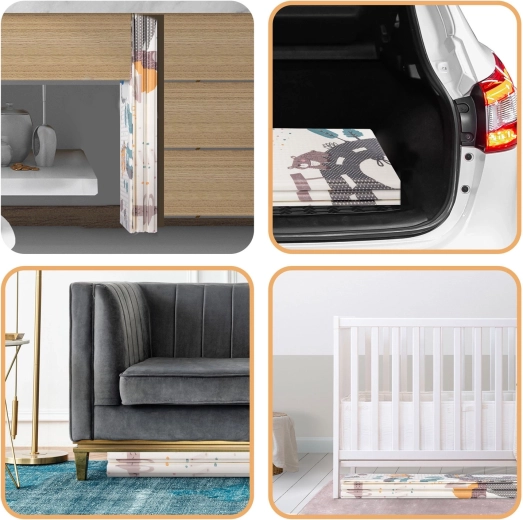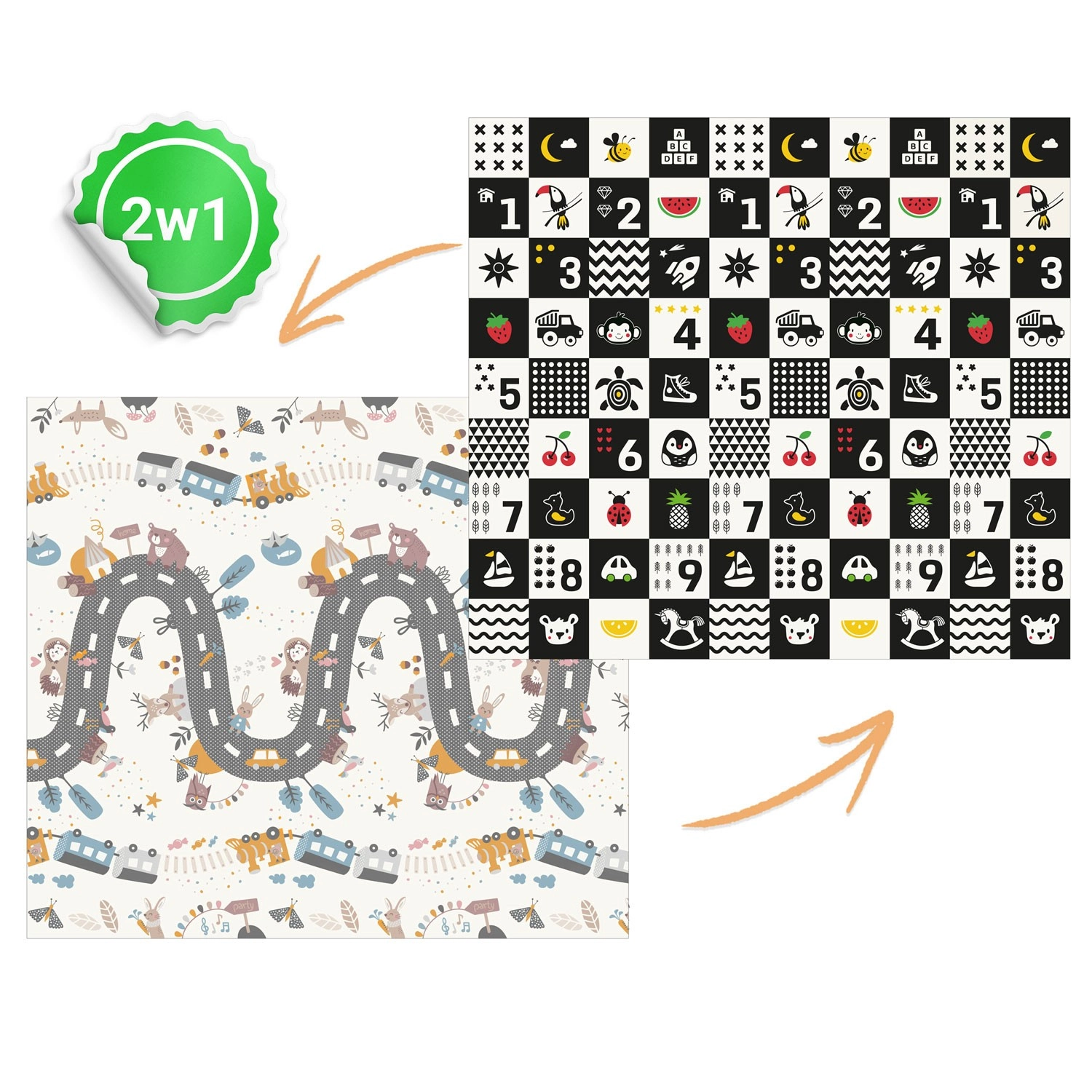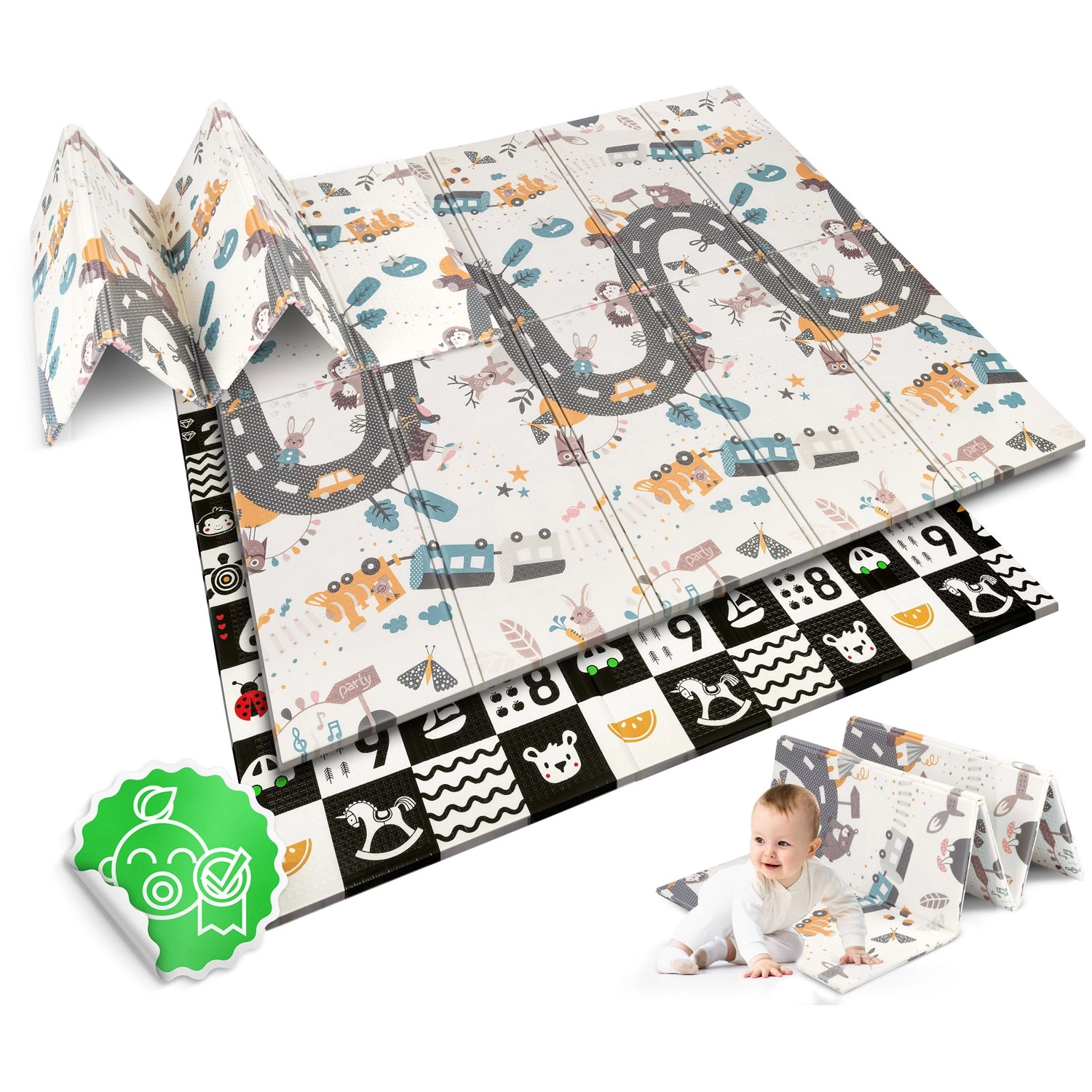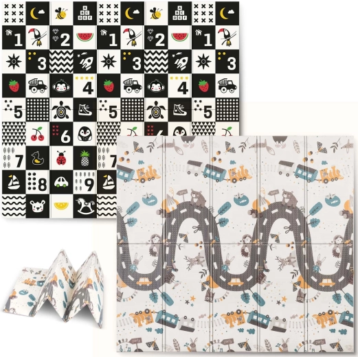 Un côté propose des motifs éducatifs à fort contraste avec des chiffres pour stimuler la vision et l’éveil précoce, l’autre côté présente une scène routière et animale pour un jeu créatif et l’imagination.