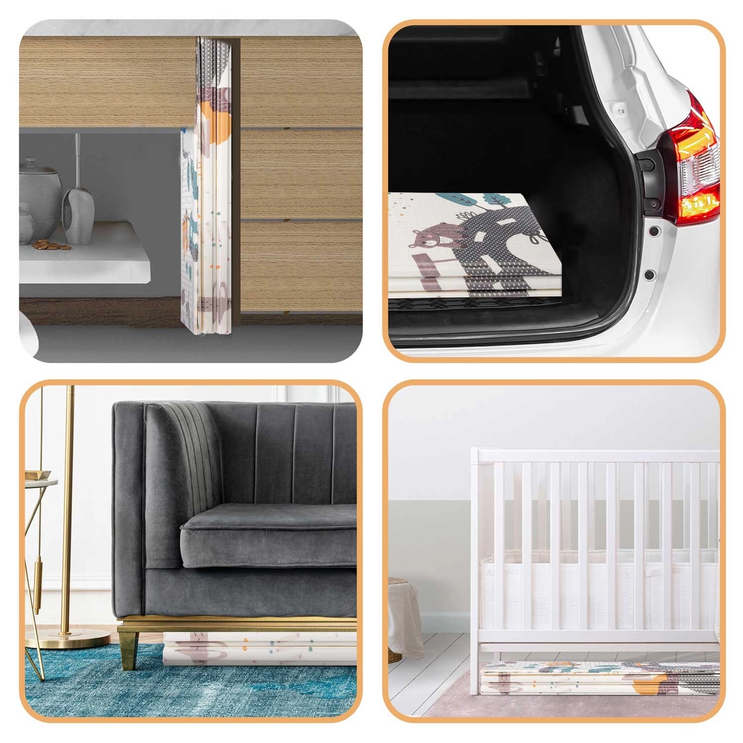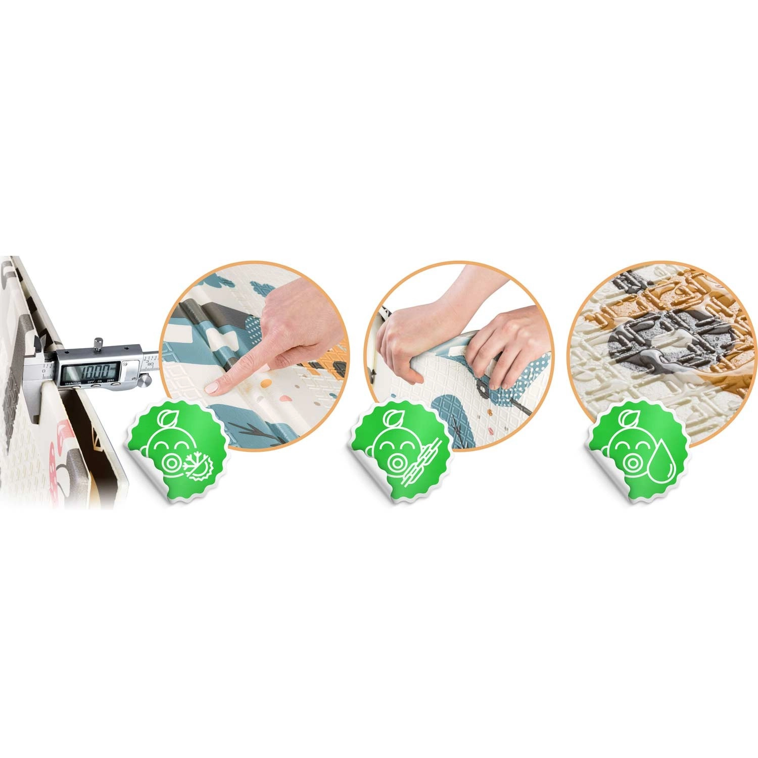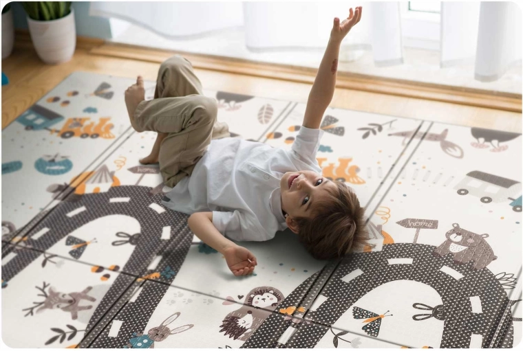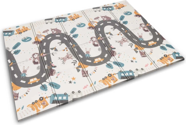Grâce au pliage en accordéon, il se transporte facilement et se range sous un lit ou dans le coffre de la voiture. Il est imperméable : un simple coup de chiffon humide suffit. La texture antidérapante accompagne les premiers pas et les jeux en toute sécurité. Le matériau XPE est inodore, hypoallergénique et facile d’entretien, au quotidien pour les parents comme pour les enfants.