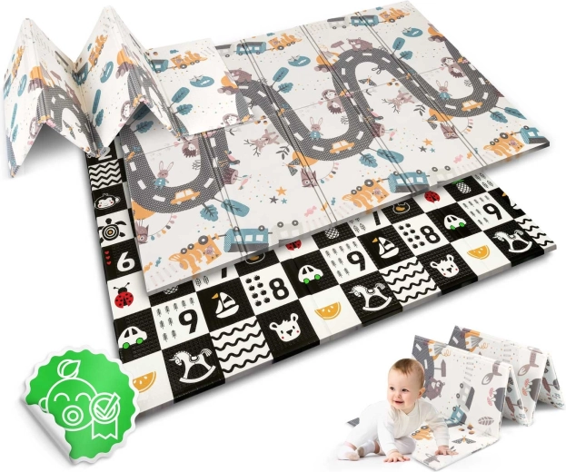 Pratique et stylé, ce tapis pour enfants en mousse XPE de qualité aux dimensions 200 × 150 × 1 cm offre un environnement doux et sécurisé pour jouer, ramper et faire ses premiers pas. Il est réversible (face éducative contrastée et face route avec des animaux), pliable, léger, imperméable et facile à nettoyer. Grâce à sa texture antidérapante, sa protection thermique contre le sol et sa composition sans BPA, PVC, phtalates ni formamide, il respecte les normes européennes strictes et offre aux enfants un confort et une sécurité premium.