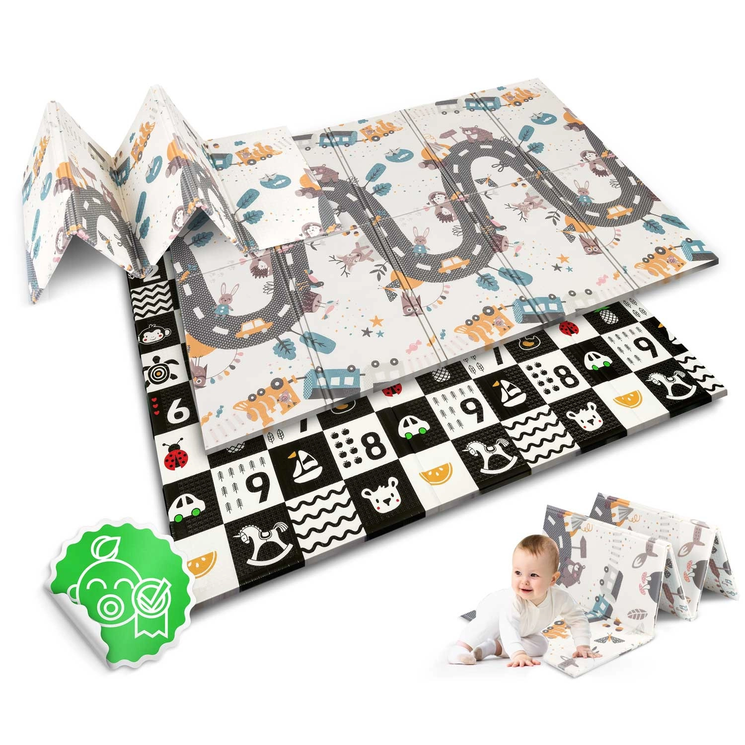 Face à haut contraste avec chiffres et icônes pour l’apprentissage précoce et la stimulation visuelle ; autre face avec route et animaux pour des jeux créatifs avec des petites voitures.
