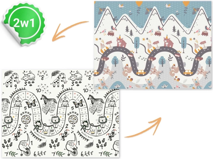 Chaque face propose un motif différent – des animaux ludiques et des chiffres aux routes et paysages – pour stimuler l’imagination, le calcul et le jeu autonome.