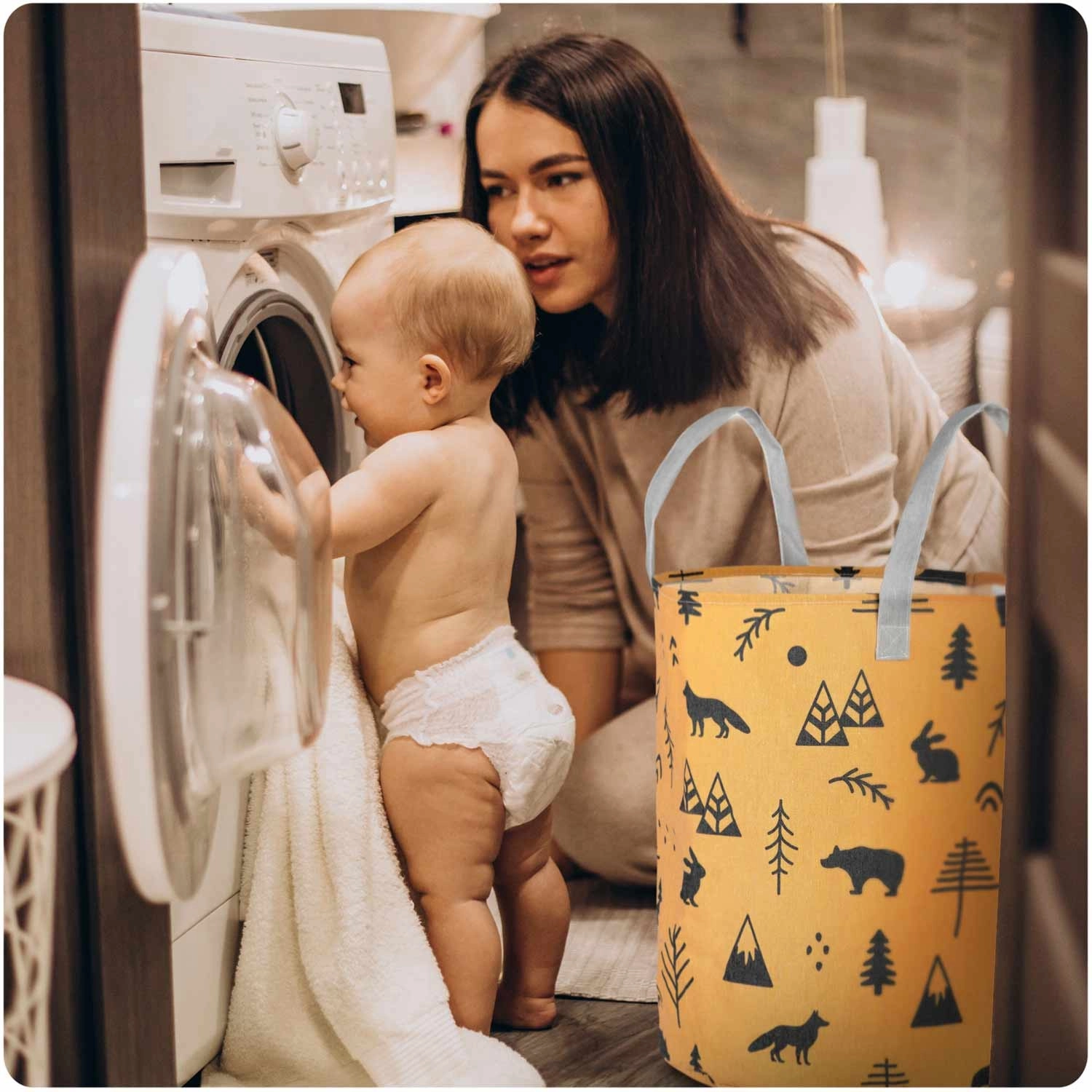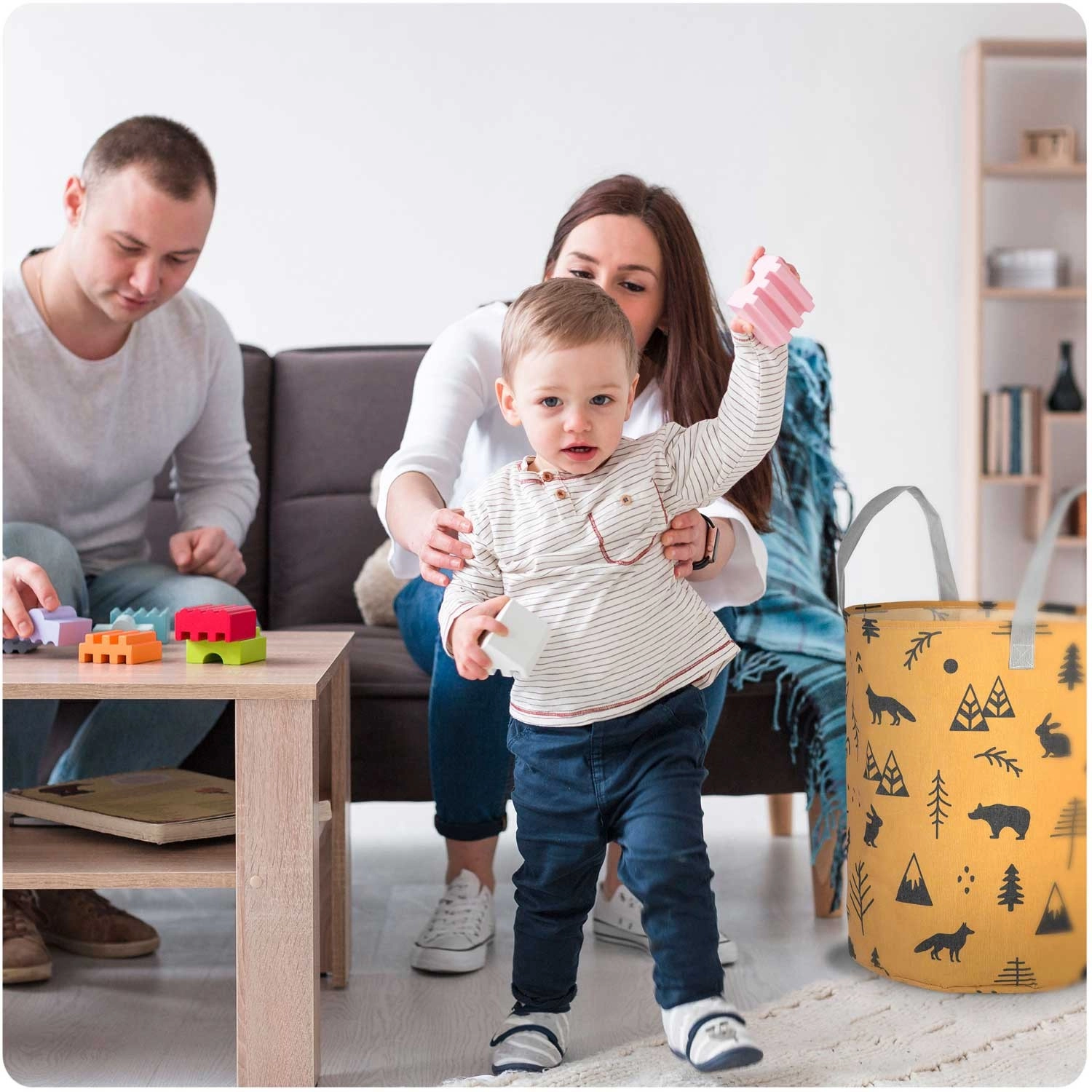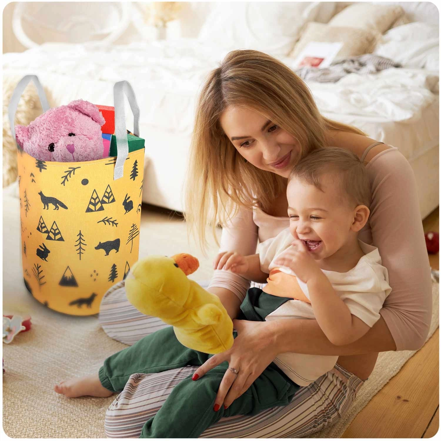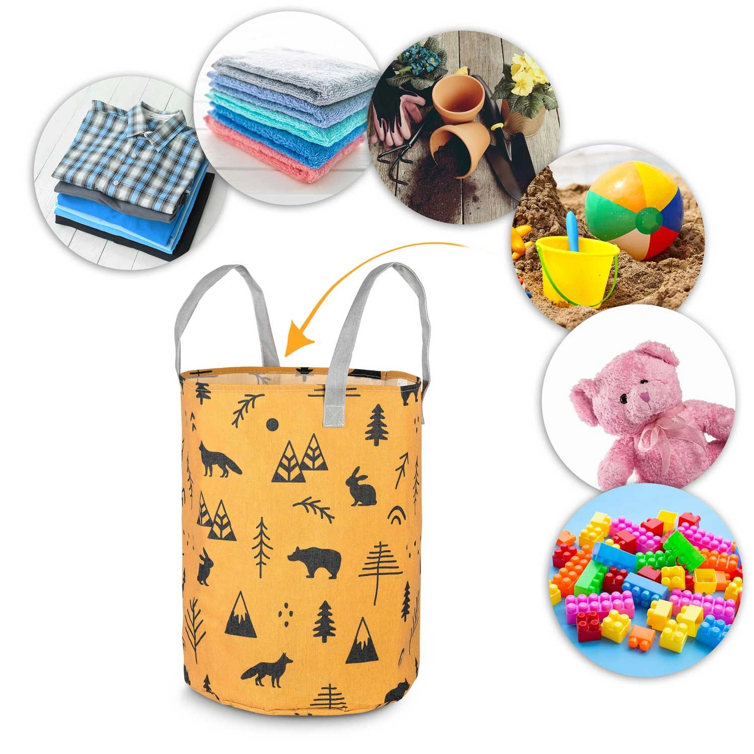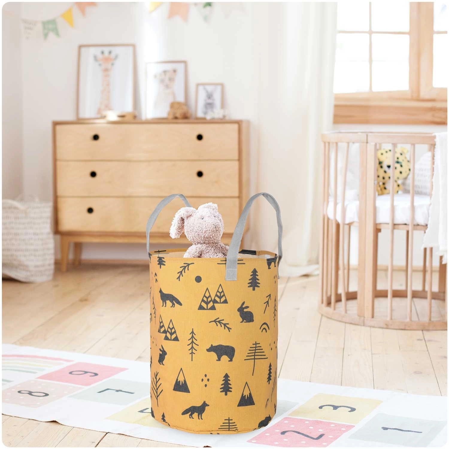 Le panier est léger et portable grâce à ses poignées robustes, tout en conservant sa forme et en restant autoportant. Il convient à la chambre d’enfant, à la salle de bain comme au salon – utilisez-le pour les jouets, le linge, les plaids ou les accessoires. Sa surface est facile à entretenir et son imprimé apporte une touche chaleureuse et ludique à la pièce.
