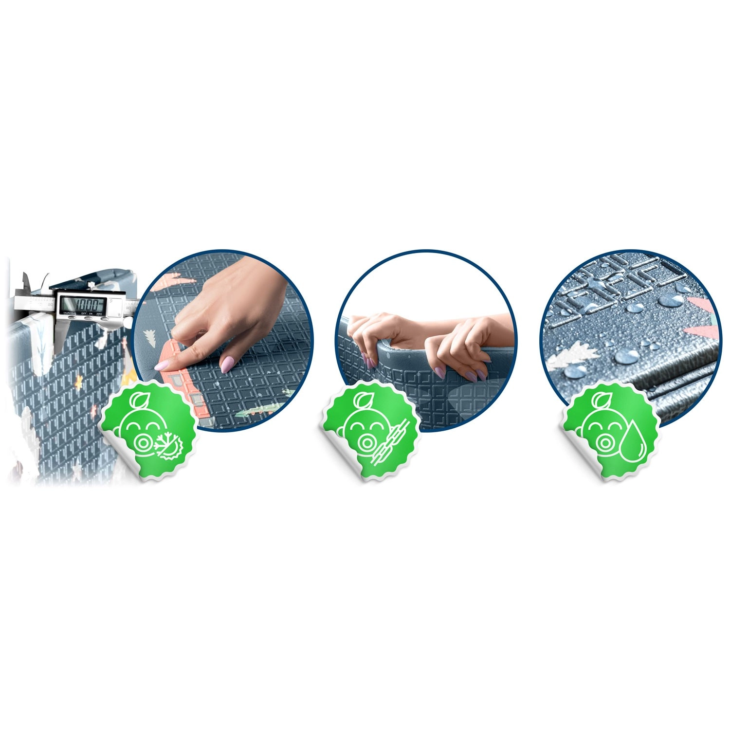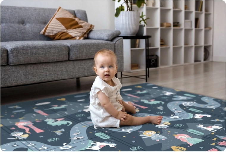 Le tapis est imperméable et facile à nettoyer – il suffit d’essuyer avec un chiffon humide. Sa structure antidérapante assure la stabilité sur différents sols et son pliage solide à répétition facilite le transport et le rangement à la maison, dans la voiture ou sous le lit. Le matériau ne contient ni BPA, ni PVC, ni phtalates, ni formamide et répond aux normes de sécurité européennes EN71, avec certification CE.