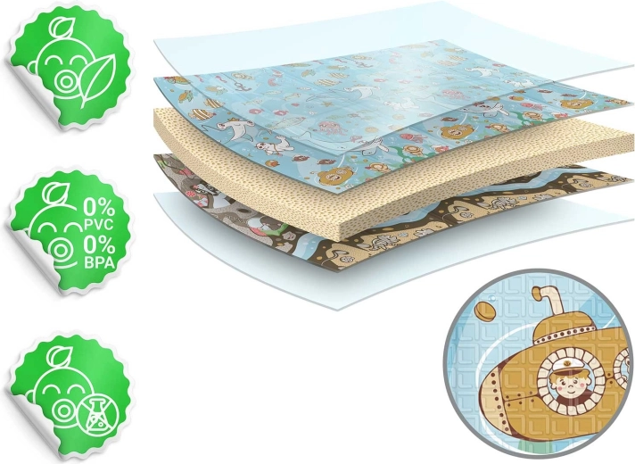 Le tapis est pliable en accordéon, léger et portable – emportez-le facilement en pique-nique, au salon ou au jardin. Sa surface imperméable se nettoie d’un simple coup de chiffon humide, et la texture antidérapante assure la stabilité. Le matériau est exempt de substances nocives (BPA, PVC, phtalates, formamide) et répond aux strictes normes européennes EN71-1/2/3 ainsi qu’au marquage CE.