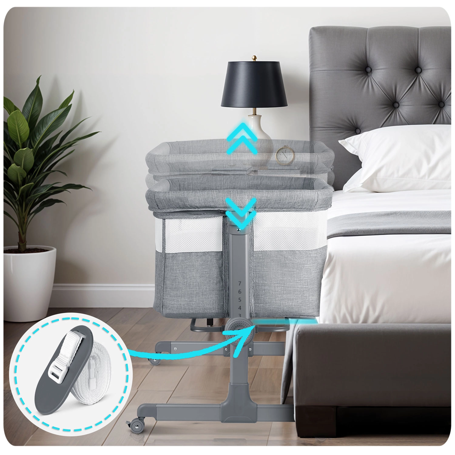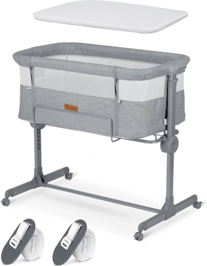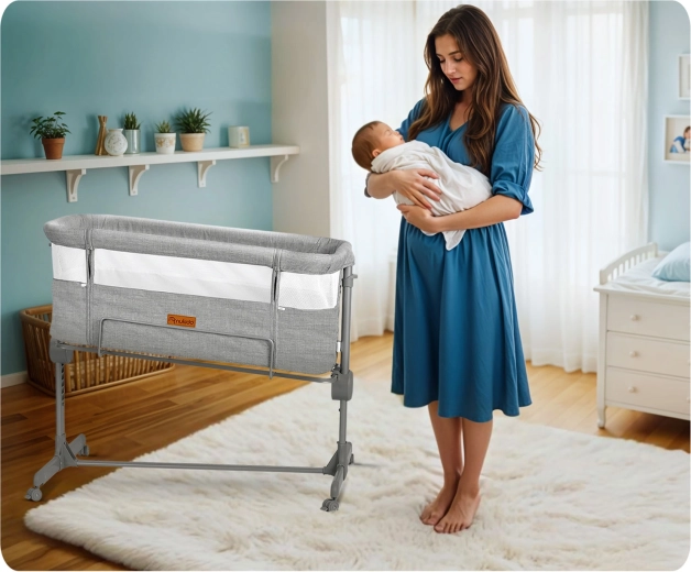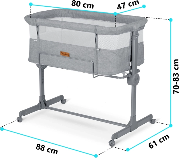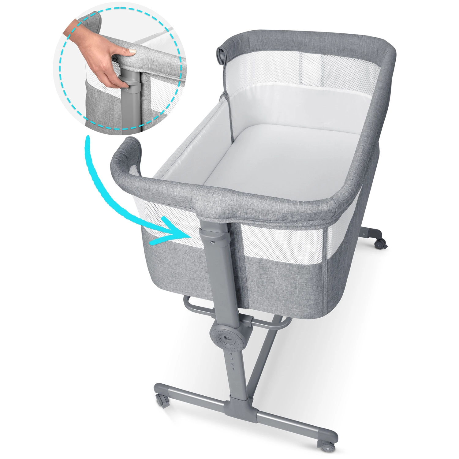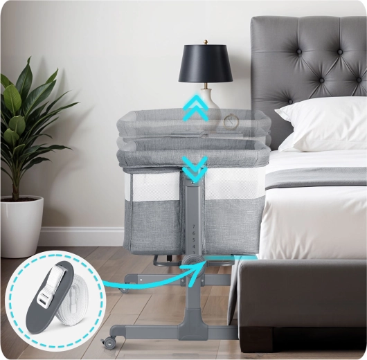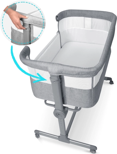Déplacez facilement le berceau dans l’appartement et fixez-le en toute sécurité. Le cadre stable et le système de blocage de qualité garantissent une utilisation sûre au bord du lit.