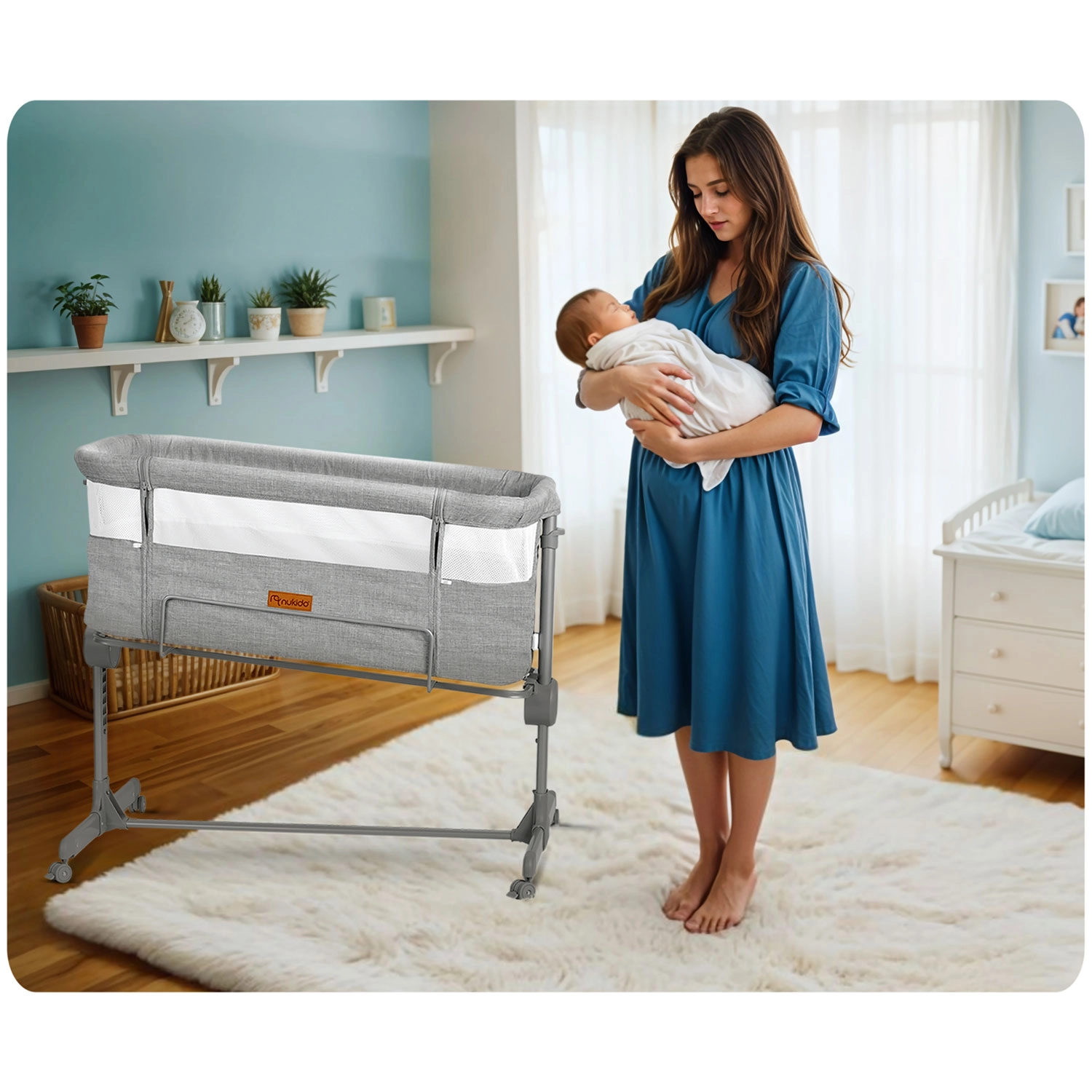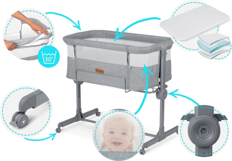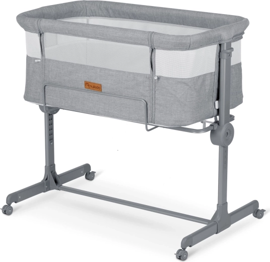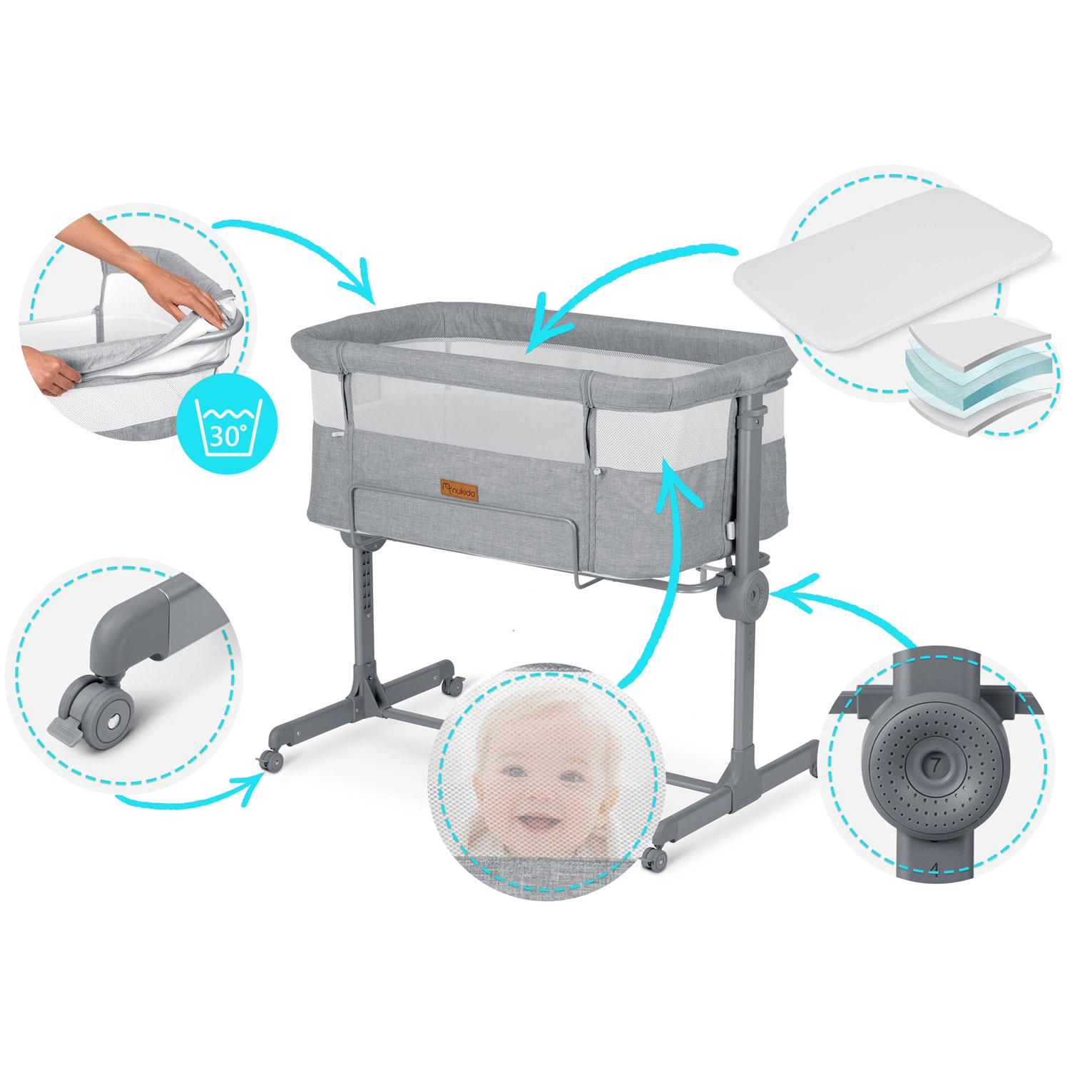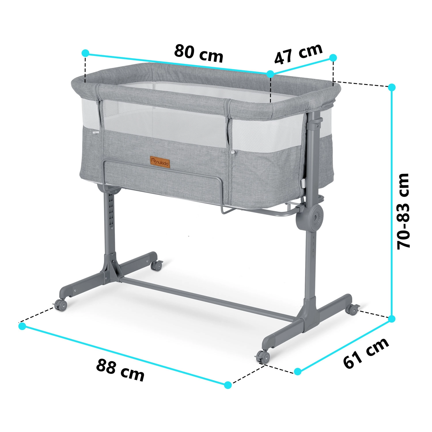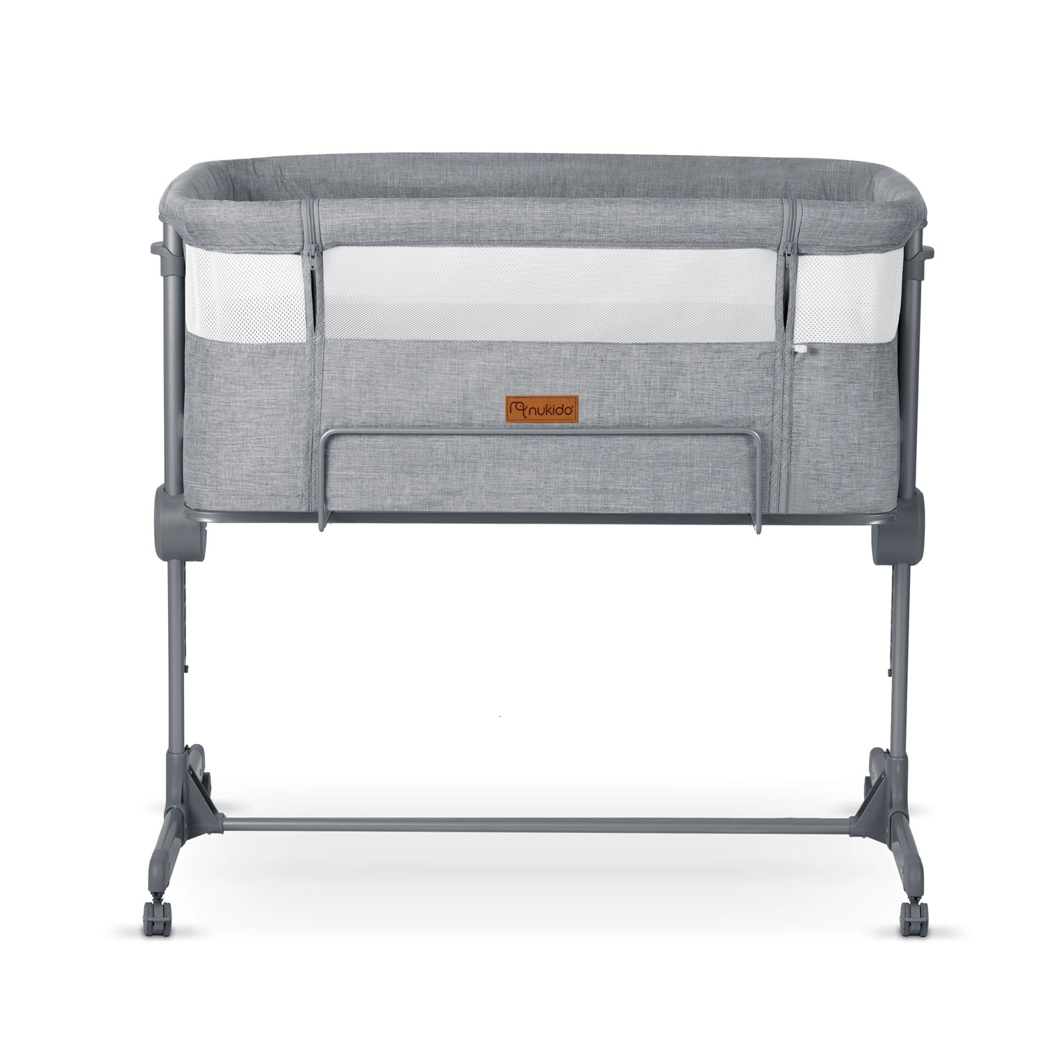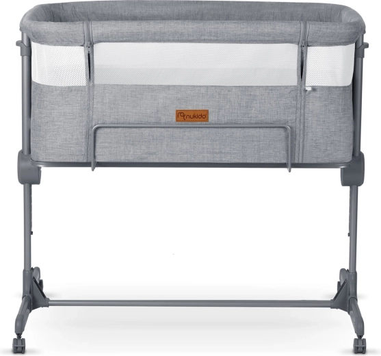 Le berceau cododo pratique NUKIDO, en élégant coloris gris, offre un sommeil sécurisé pour le bébé juste à côté du lit des parents. Grâce au réglage de hauteur bilatéral indépendant, aux côtés en maille respirante et à ses 4 roulettes avec freins, il est parfait pour l’allaitement nocturne, une surveillance aisée et des déplacements confortables dans l’appartement.